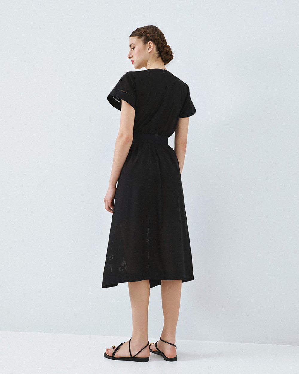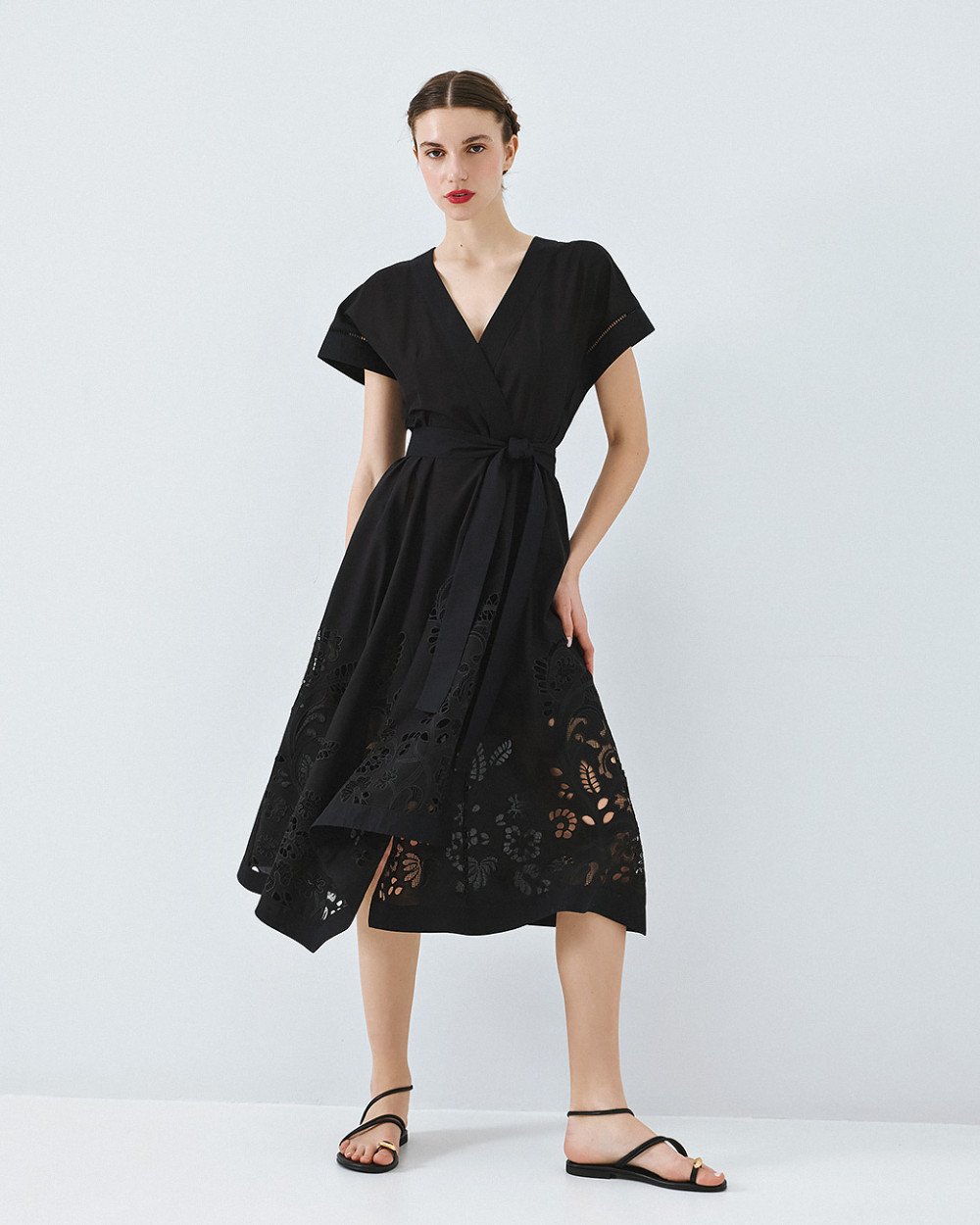 Κομψό και ξεχωριστό, αυτό το μαύρο μίντι φόρεμα είναι η ιδανική επιλογή για θηλυκές εμφανίσεις με διαχρονικό χαρακτήρα. Το κρουαζέ σχέδιο στο μπούστο αγκαλιάζει όμορφα το σώμα, ενώ η ζώνη στη μέση τονίζει τη σιλουέτα και προσθέτει elegant ύφος. Τα κοντά μανίκια και η ανάλαφρη γραμμή χαρίζουν άνεση και κίνηση, ενώ οι διάτρητες λεπτομέρειες στο τελείωμα δίνουν μία ιδιαίτερη, ρομαντική πινελιά. Φοριέται εύκολα από το πρωί στο γραφείο έως τις βραδινές εξόδους και αποτελεί ένα must-have κομμάτι για κάθε γκαρνταρόμπα.