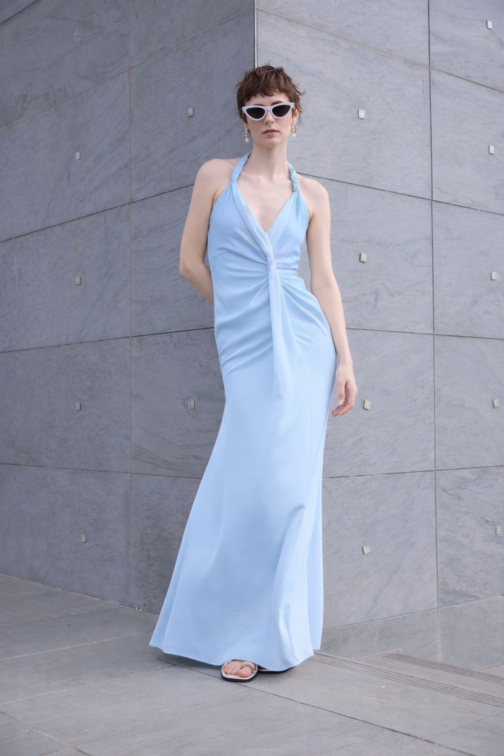 Αέρινο maxi φόρεμα σε απαλή baby blue απόχρωση, που αποπνέει ρομαντισμό και κομψότητα. Η halter λαιμόκοψη αναδεικνύει τους ώμους και το ντεκολτέ, ενώ η διακριτική draped λεπτομέρεια στο μπροστινό μέρος αγκαλιάζει τη μέση και κολακεύει τη σιλουέτα.
