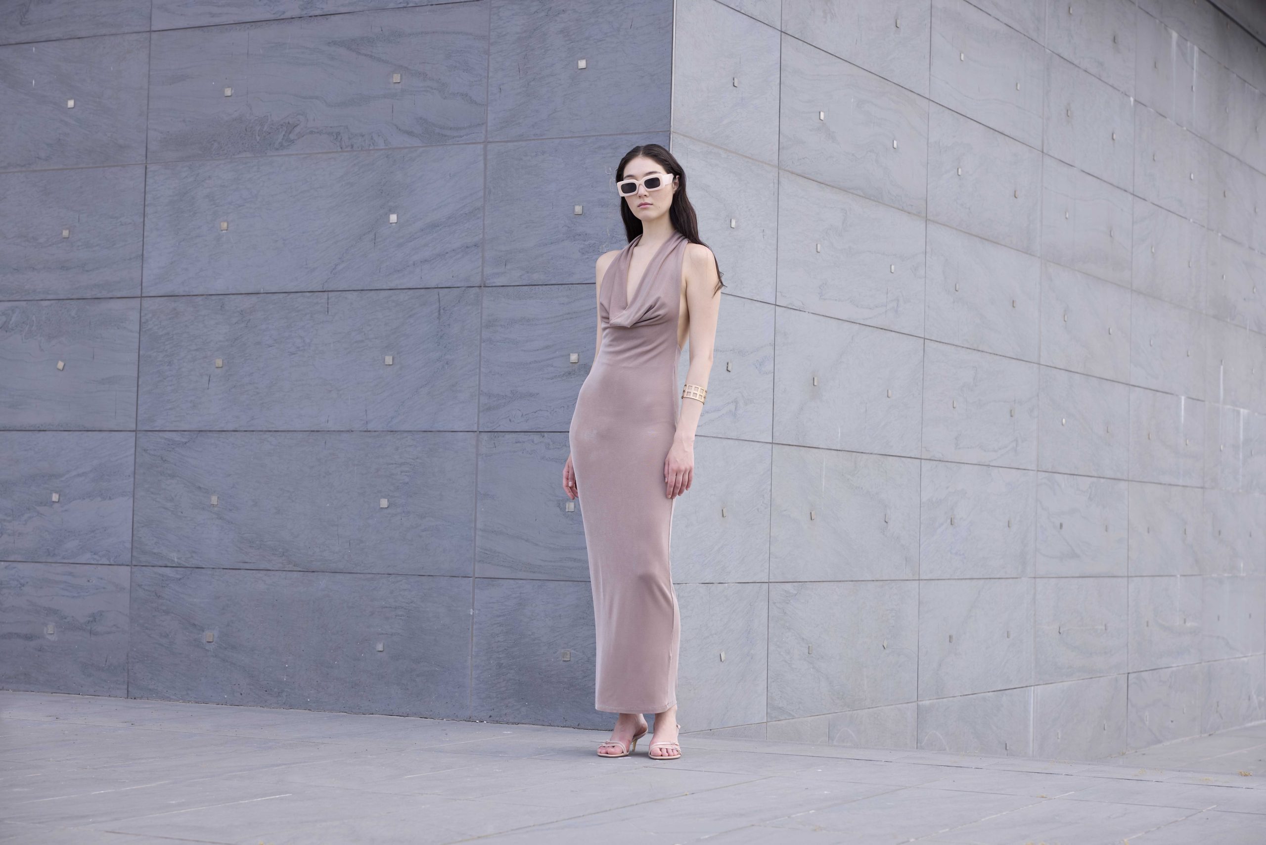 Αναδείξτε τη θηλυκότητά σας με αυτό το εντυπωσιακό maxi φόρεμα σε ζεστή απόχρωση mocha. Ο halter σχεδιασμός αγκαλιάζει τον λαιμό και αφήνει την πλάτη ανοιχτή, ενώ το ντραπέ ντεκολτέ χαρίζει κομψότητα και διακριτική sensual διάθεση. Η εφαρμοστή γραμμή αγκαλιάζει το σώμα και καταλήγει σε ίσια, μακριά σιλουέτα που επιμηκύνει τη φιγούρα.