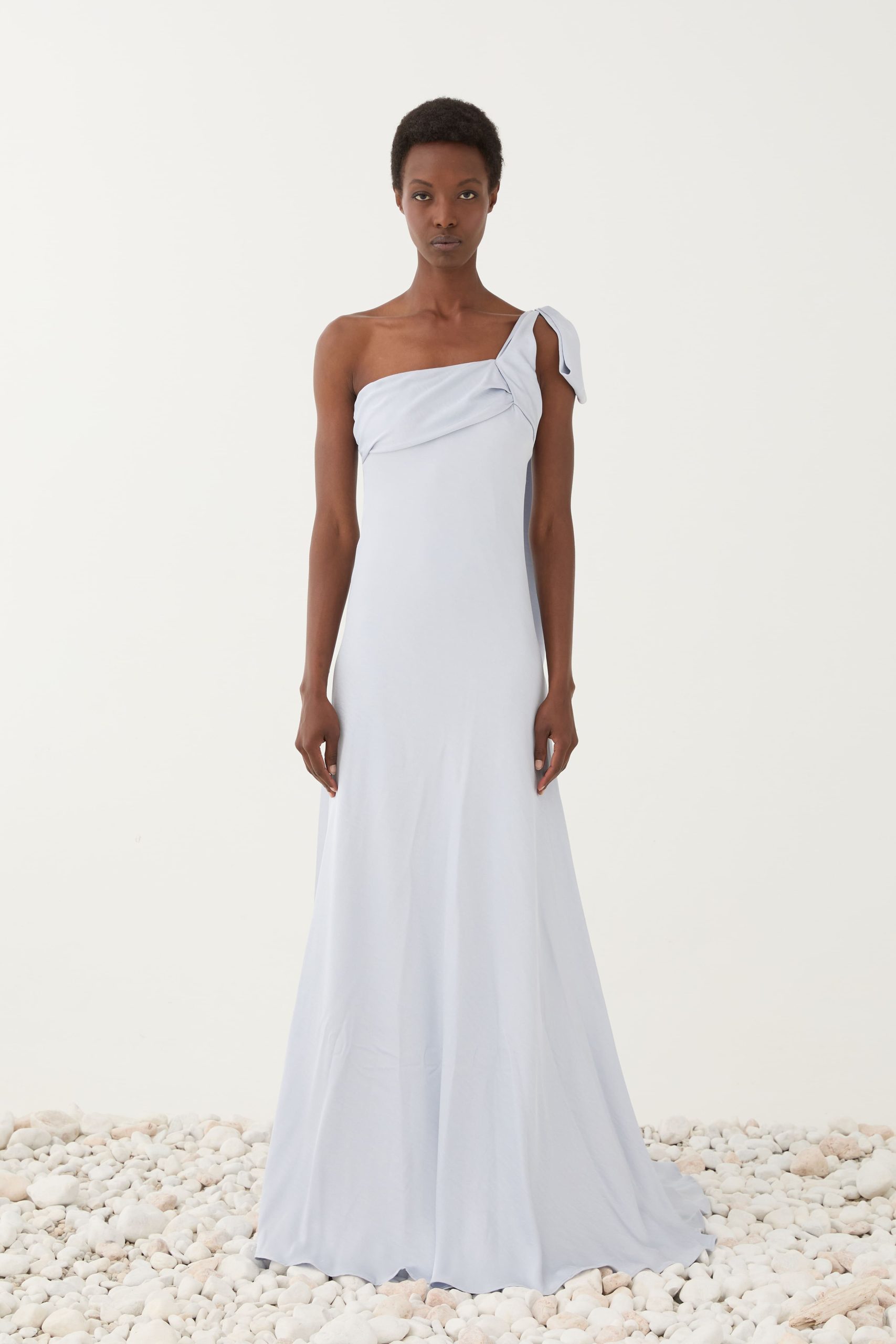 Εντυπωσιακό maxi φόρεμα σε απαλό baby blue, σχεδιασμένο για κομψές και σύγχρονες εμφανίσεις. Η one-shoulder γραμμή αναδεικνύει διακριτικά τους ώμους, ενώ η draped λεπτομέρεια στο μπούστο και ο διακοσμητικός φιόγκος στον ώμο προσθέτουν θηλυκότητα και αρχιτεκτονικό χαρακτήρα.
