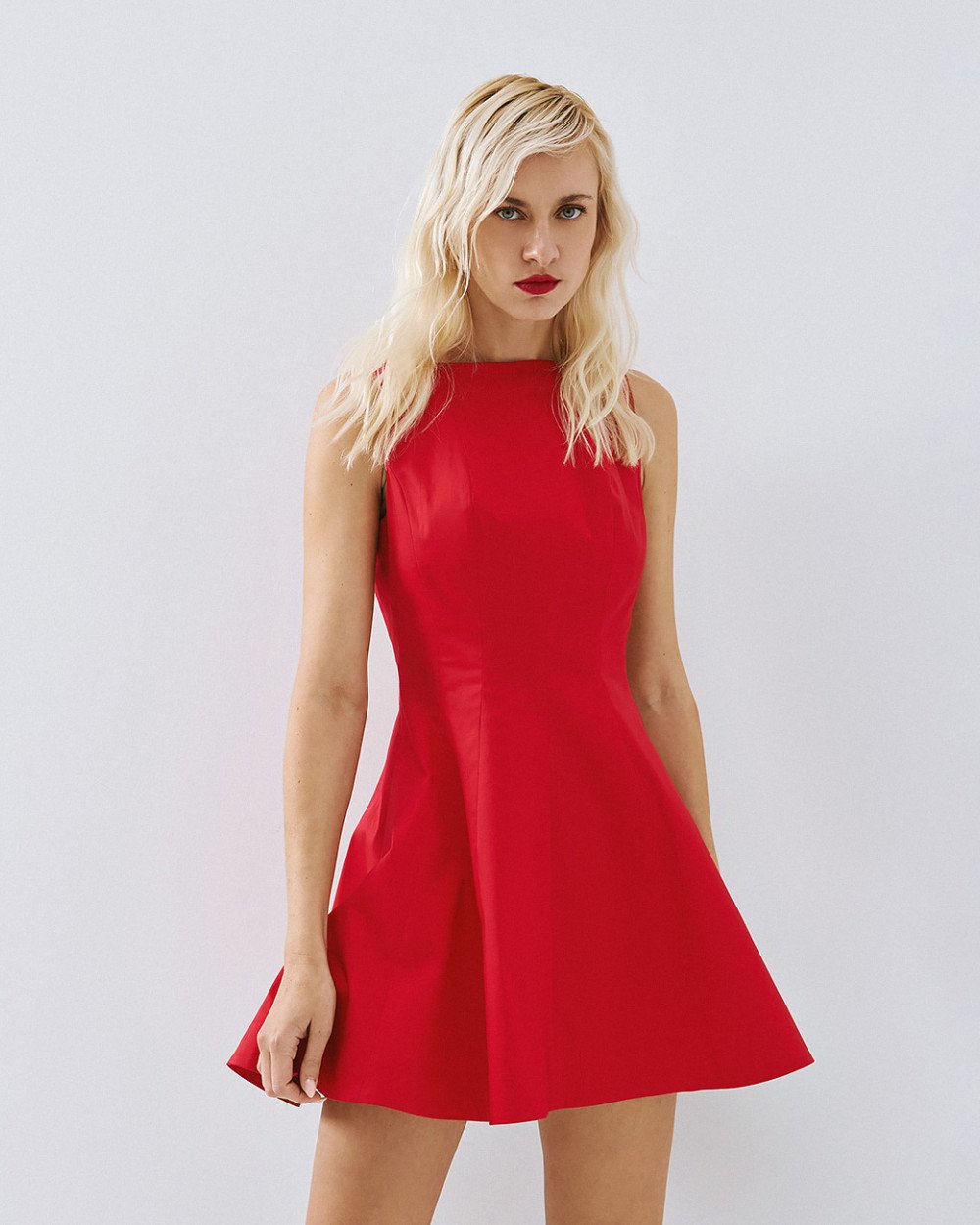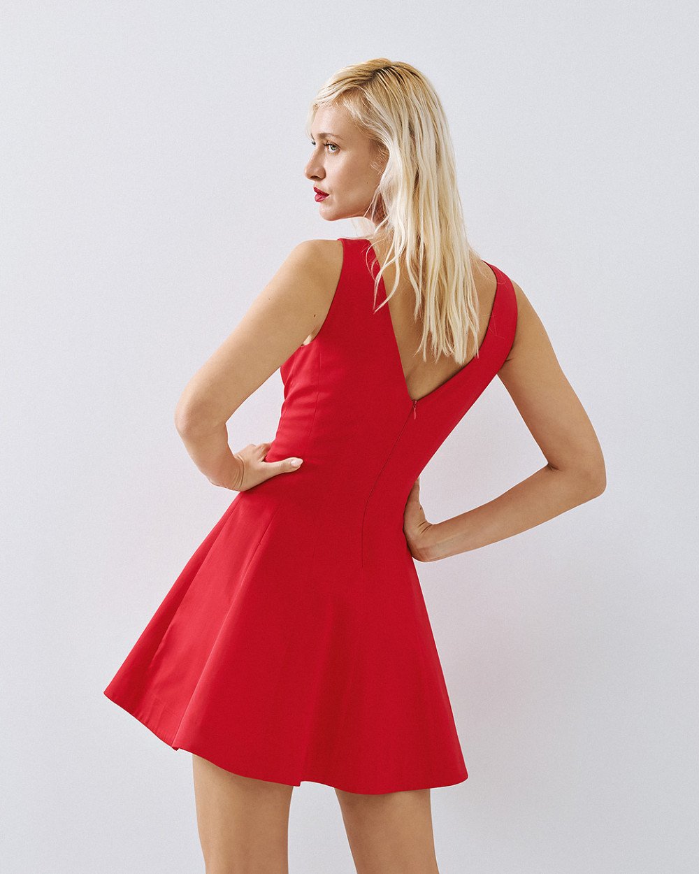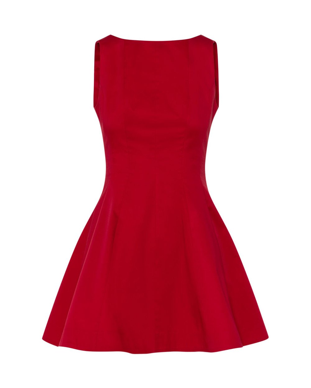 Αμάνικο φόρεμα μίνι κλος με λαιμόκοψη χαμόγελο και διακοσμητικές ραφές. Διαθέτει V άνοιγμα στην πλάτη, κλείσιμο με φερμουάρ πίσω και ενσωματωμένη φόδρα.