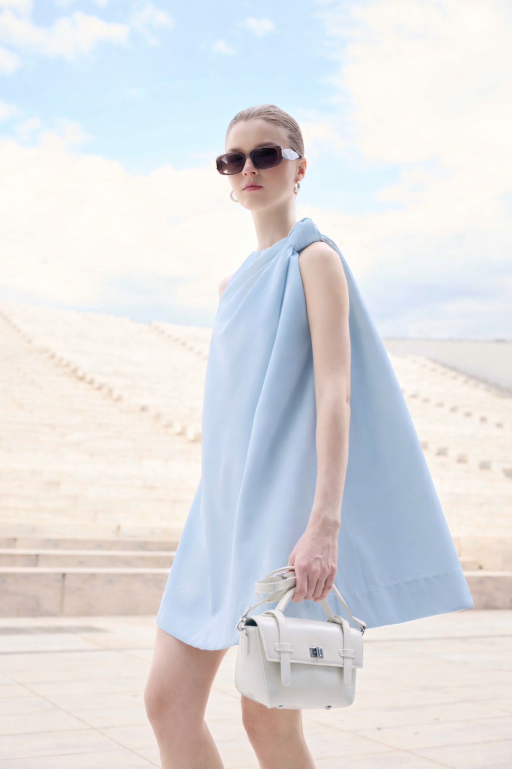 Αέρινο, κομψό και απόλυτα καλοκαιρινό. Το mini φόρεμα σε απαλή σιέλ απόχρωση είναι η ιδανική επιλογή για chic εμφανίσεις με minimal αισθητική.