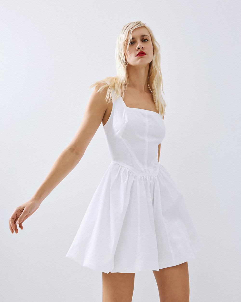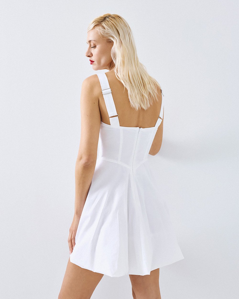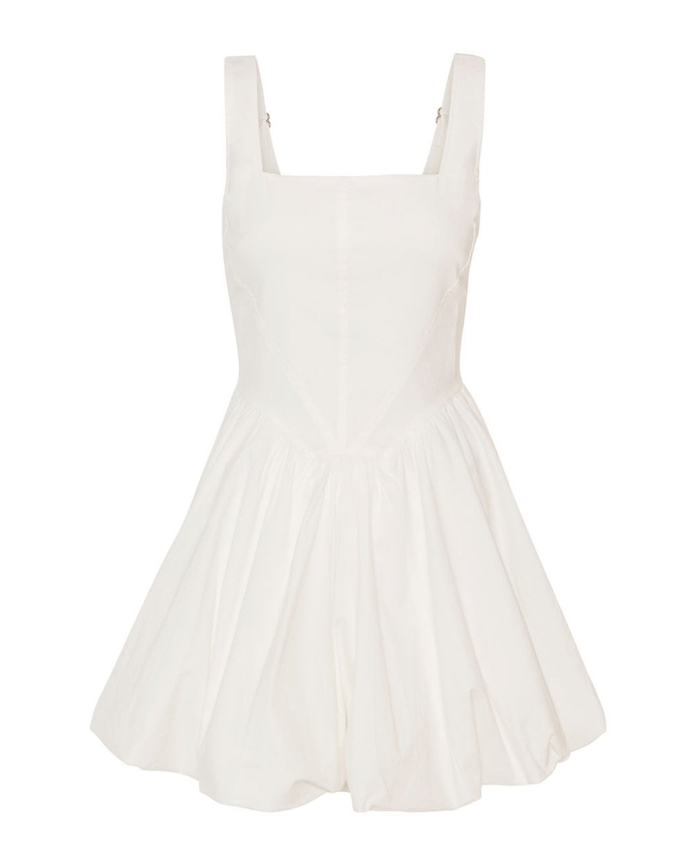 Μίνι βαμβακερό φόρεμα με balloon τελείωμα, τετράγωνη λαιμόκοψη και ρυθμιζόμενες τιράντες. Διαθέτει λεπτομέρειες από σούρες και κλείσιμο με φερμουάρ στο πίσω μέρος.