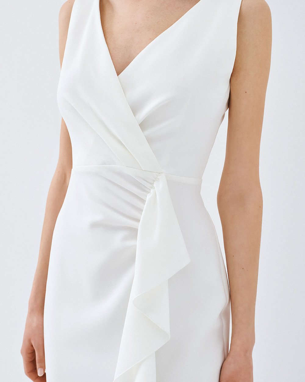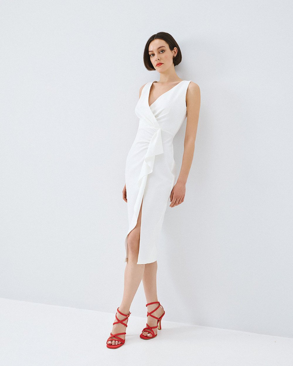 Μίντι αμάνικο κρουαζέ φόρεμα με βολάν και σκίσιμο μπροστά. Διαθέτει λεπτομέρειες από σούρες, V πλάτη και αποσπώμενη μίνι φούστα-μεσοφόρι.