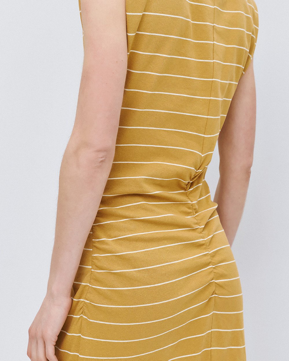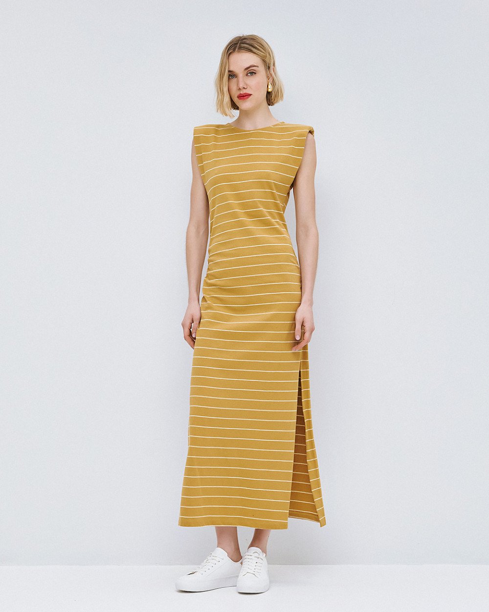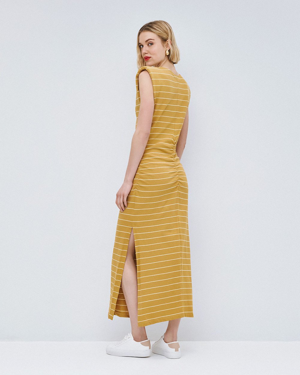 Ριγέ μίντι αμάνικο φόρεμα με στρογγυλή λαιμόκοψη, βάτες στους ώμους και λεπτομέρειες από σούρες.