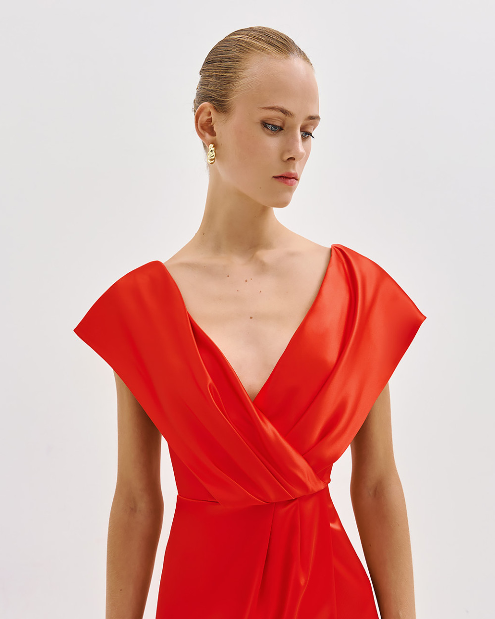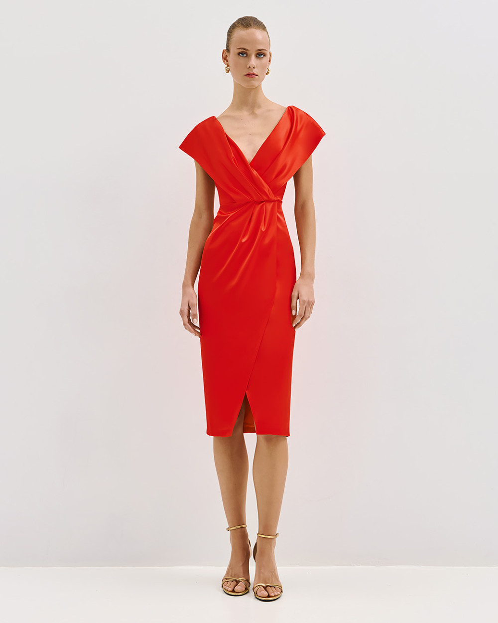 Σατέν, μίντι κρουαζέ φόρεμα με πιέτες και άνοιγμα μπροστά. Διαθέτει V λαιμόκοψη και πλάτη. Επιλέξτε το για κομψές, επίσημες εμφανίσεις.