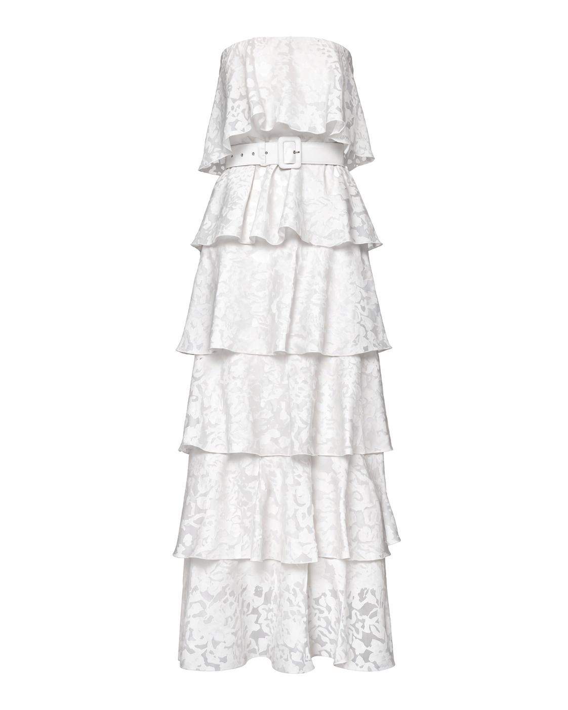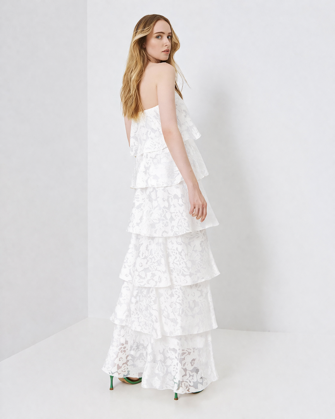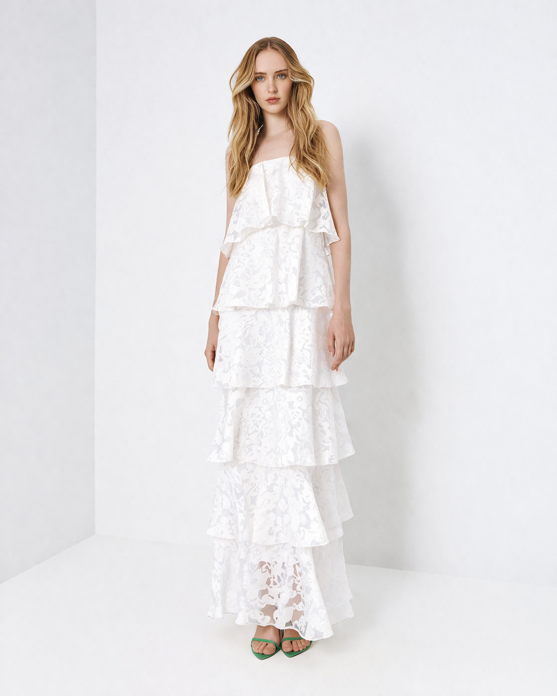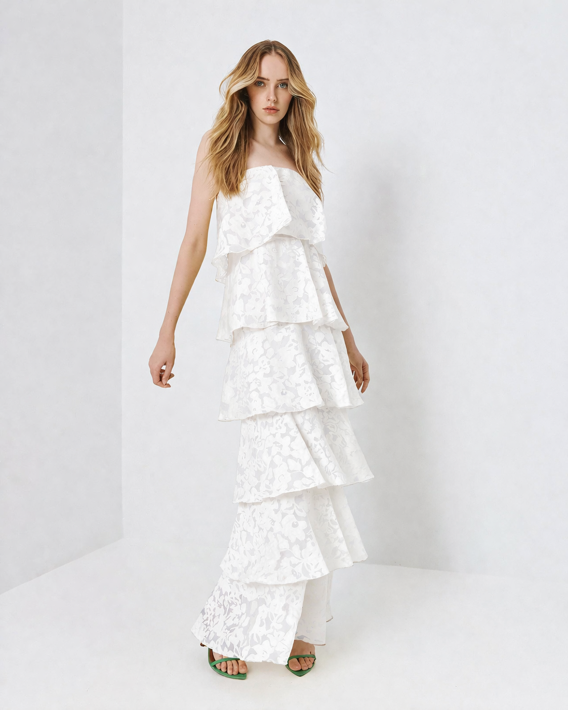 Maxi στράπλες φόρεμα, με ρομαντική διάθεση και εντυπωσιακή κίνηση. Διαθέτει ανάγλυφη floral υφή και διαδοχικά βολάν σε όλο το μήκος, που χαρίζουν αέρινη εφαρμογή και θηλυκότητα. Το στράπλες ντεκολτέ αναδεικνύει τους ώμους, ενώ η maxi γραμμή το κάνει ιδανικό για ιδιαίτερες εμφανίσεις, γάμο, βάπτιση ή καλοκαιρινό event.