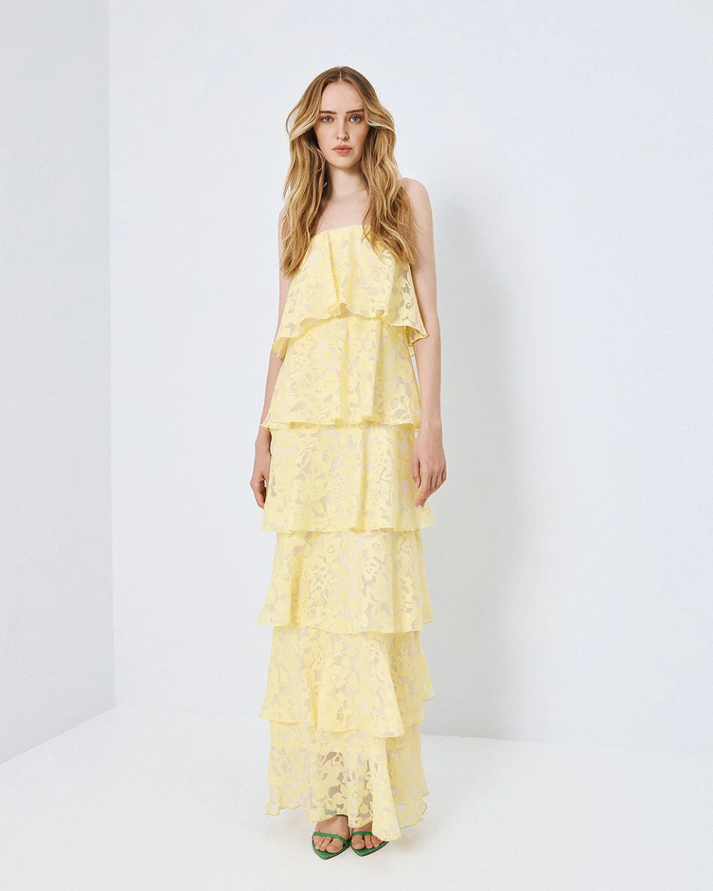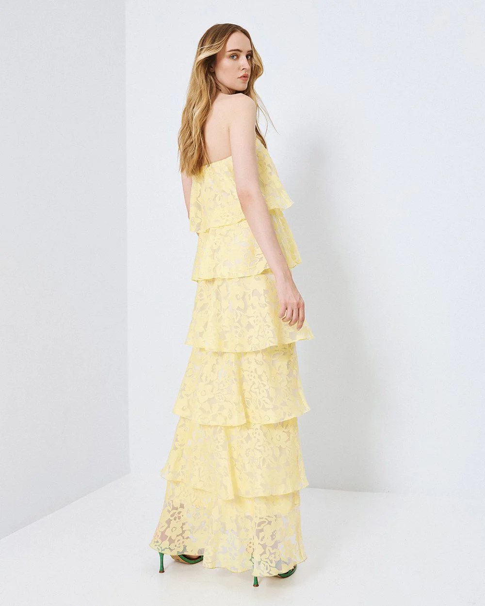 Maxi στράπλες φόρεμα, με ρομαντική διάθεση και εντυπωσιακή κίνηση. Διαθέτει ανάγλυφη floral υφή και διαδοχικά βολάν σε όλο το μήκος, που χαρίζουν αέρινη εφαρμογή και θηλυκότητα. Το στράπλες ντεκολτέ αναδεικνύει τους ώμους, ενώ η maxi γραμμή το κάνει ιδανικό για ιδιαίτερες εμφανίσεις, γάμο, βάπτιση ή καλοκαιρινό event.