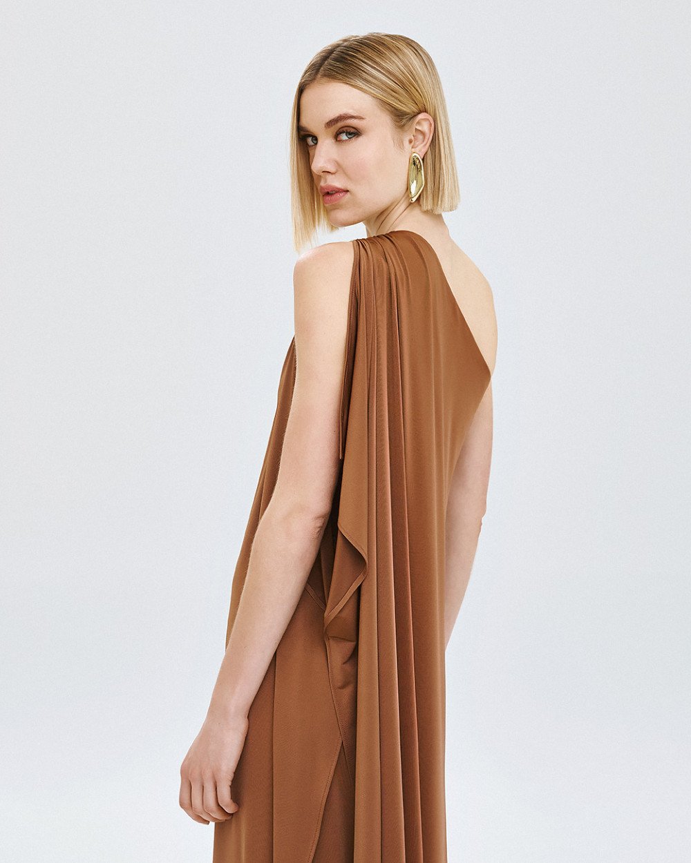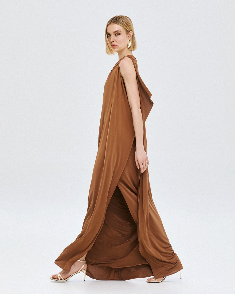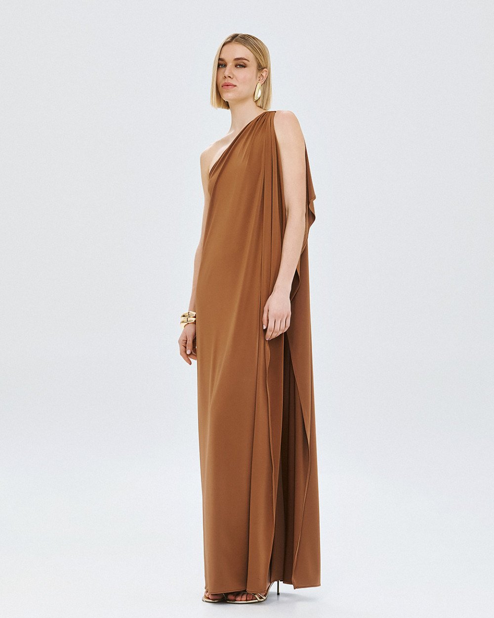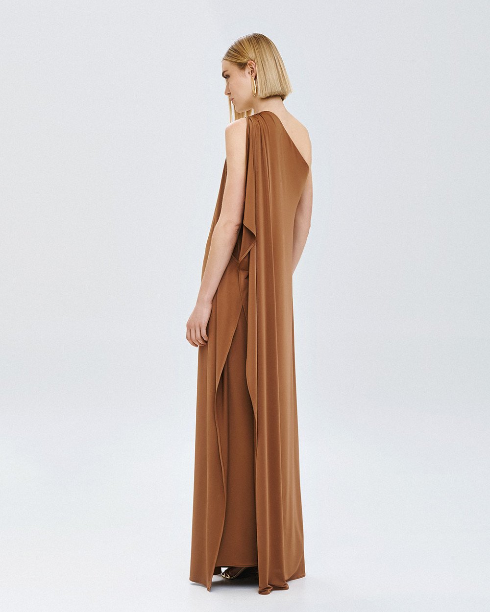 Μάξι φόρεμα με έναν ώμο και ενσωματωμένη ντραπέ λεπτομέρεια τύπου κάπας που αγκαλιάζει τον ώμο και συνεχίζει μέχρι το τελείωμα. Διαθέτει σκίσιμο στο πλάι και μεταλλική λεπτομέρεια με σούρες στον ώμο.