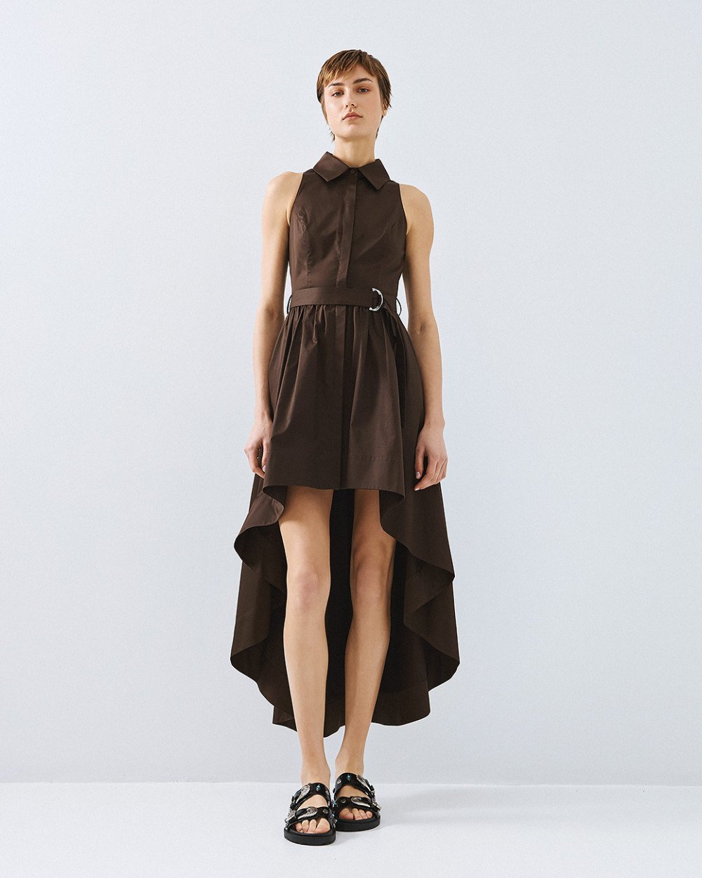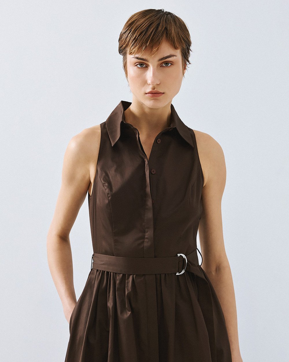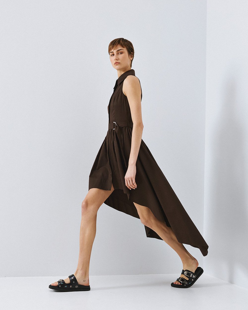 Βαμβακερό αμάνικο σεμιζιέ με γιακά και ασύμμετρο μήκος. Διαθέτει κλείσιμο με εσωτερικά κουμπιά στο μπροστινό μέρος, θηλύκια και αποσπώμενη δετή ζώνη με μεταλλική αγκράφα.