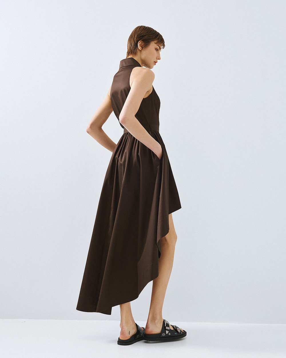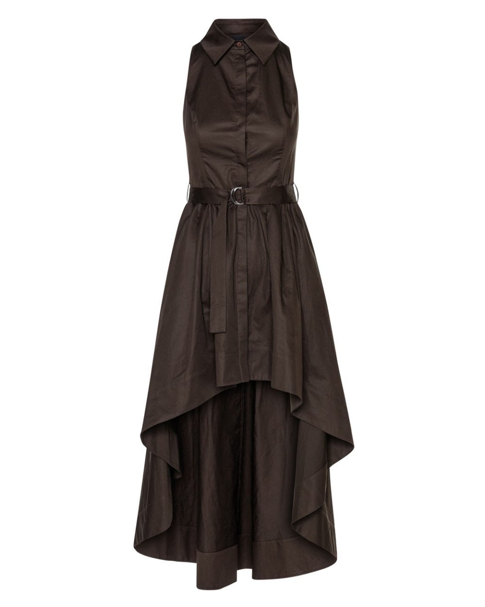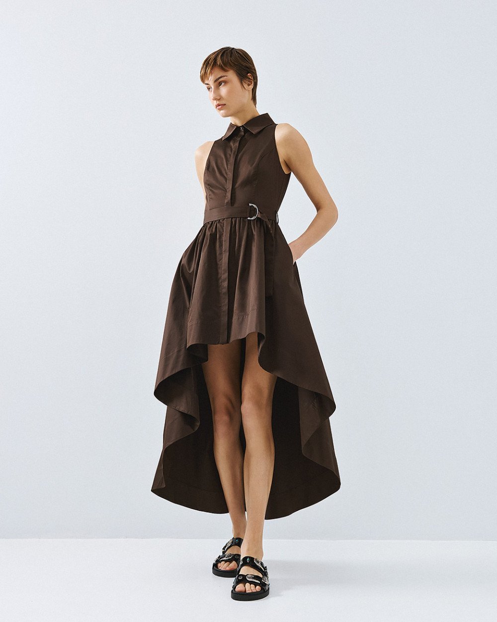 Βαμβακερό αμάνικο σεμιζιέ με γιακά και ασύμμετρο μήκος. Διαθέτει κλείσιμο με εσωτερικά κουμπιά στο μπροστινό μέρος, θηλύκια και αποσπώμενη δετή ζώνη με μεταλλική αγκράφα.