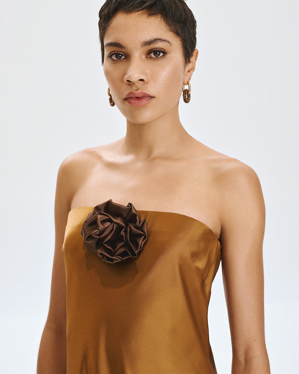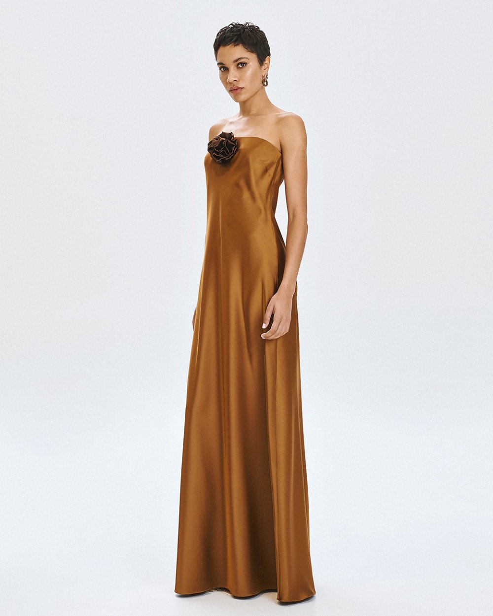 Μάξι σατέν στράπλες φόρεμα με λάστιχο περιμετρικά του στήθους και αποσπώμενη καρφίτσα λουλούδι.