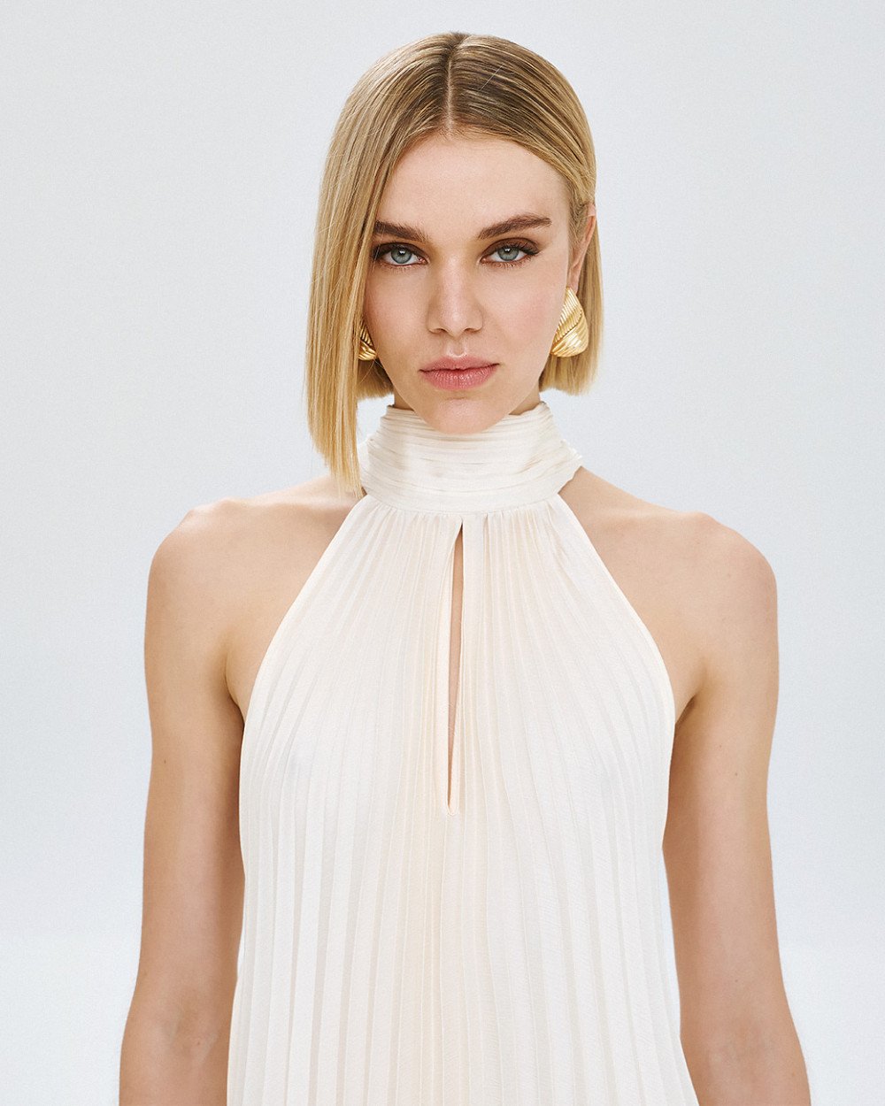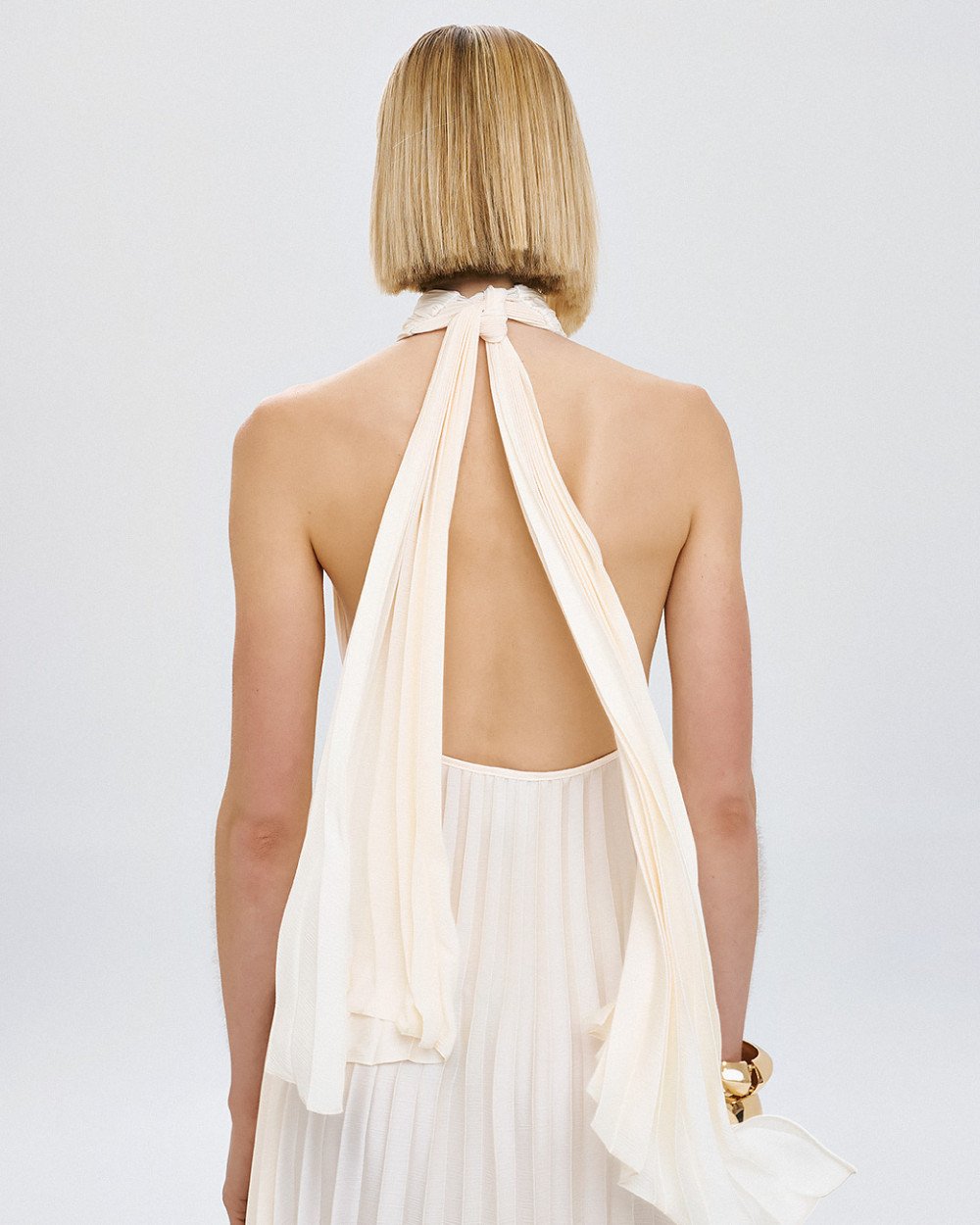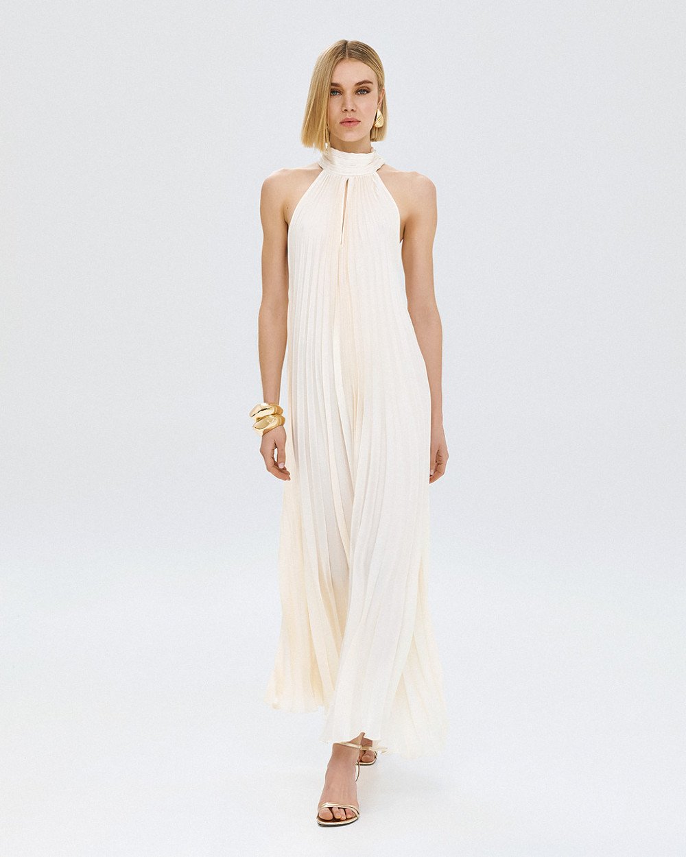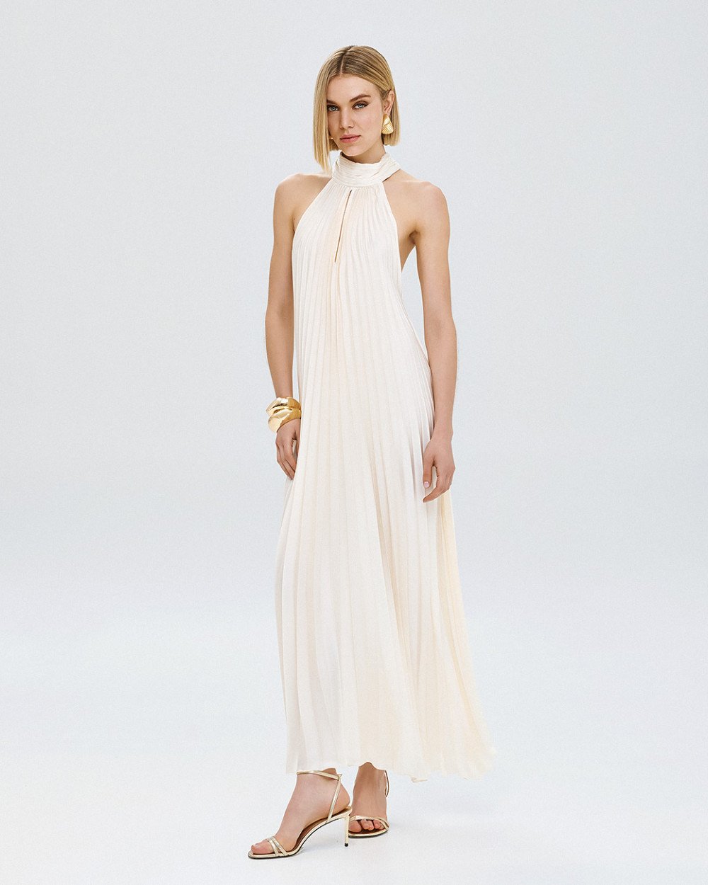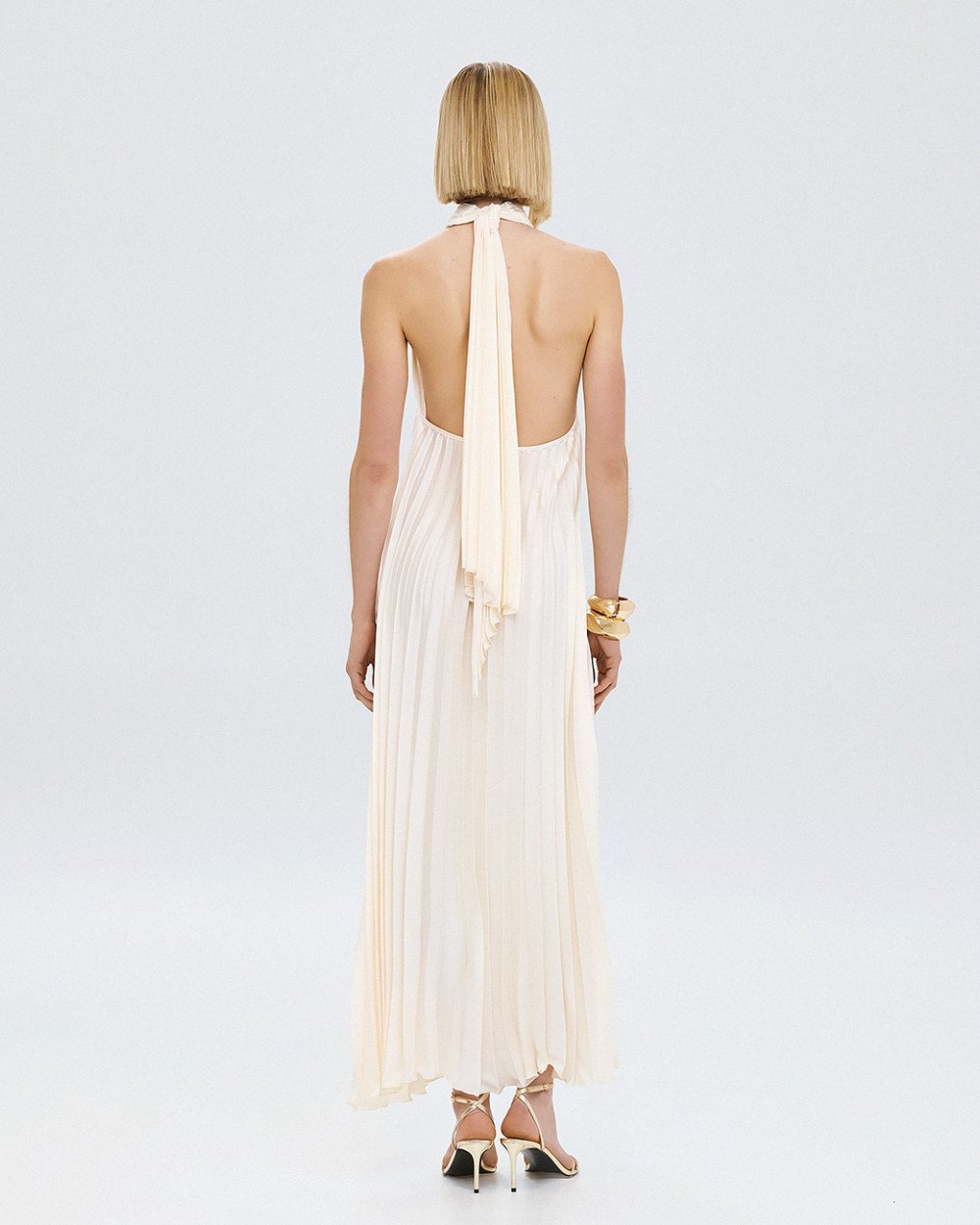 Μάξι πλισέ φόρεμα με halter λαιμόκοψη και δέσιμο πίσω στον λαιμό. Διαθέτει άνοιγμα μπροστά και ανοιχτή πλάτη.