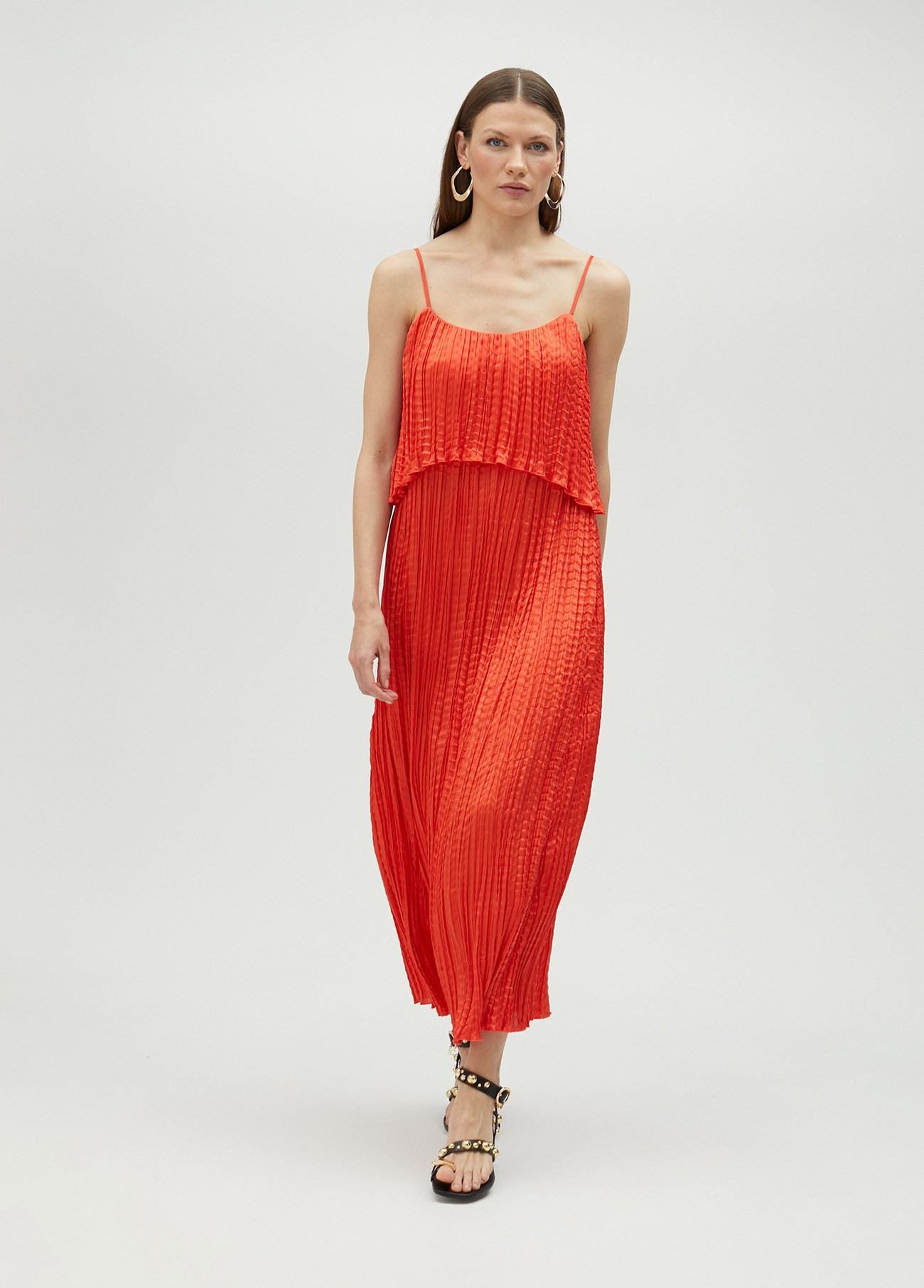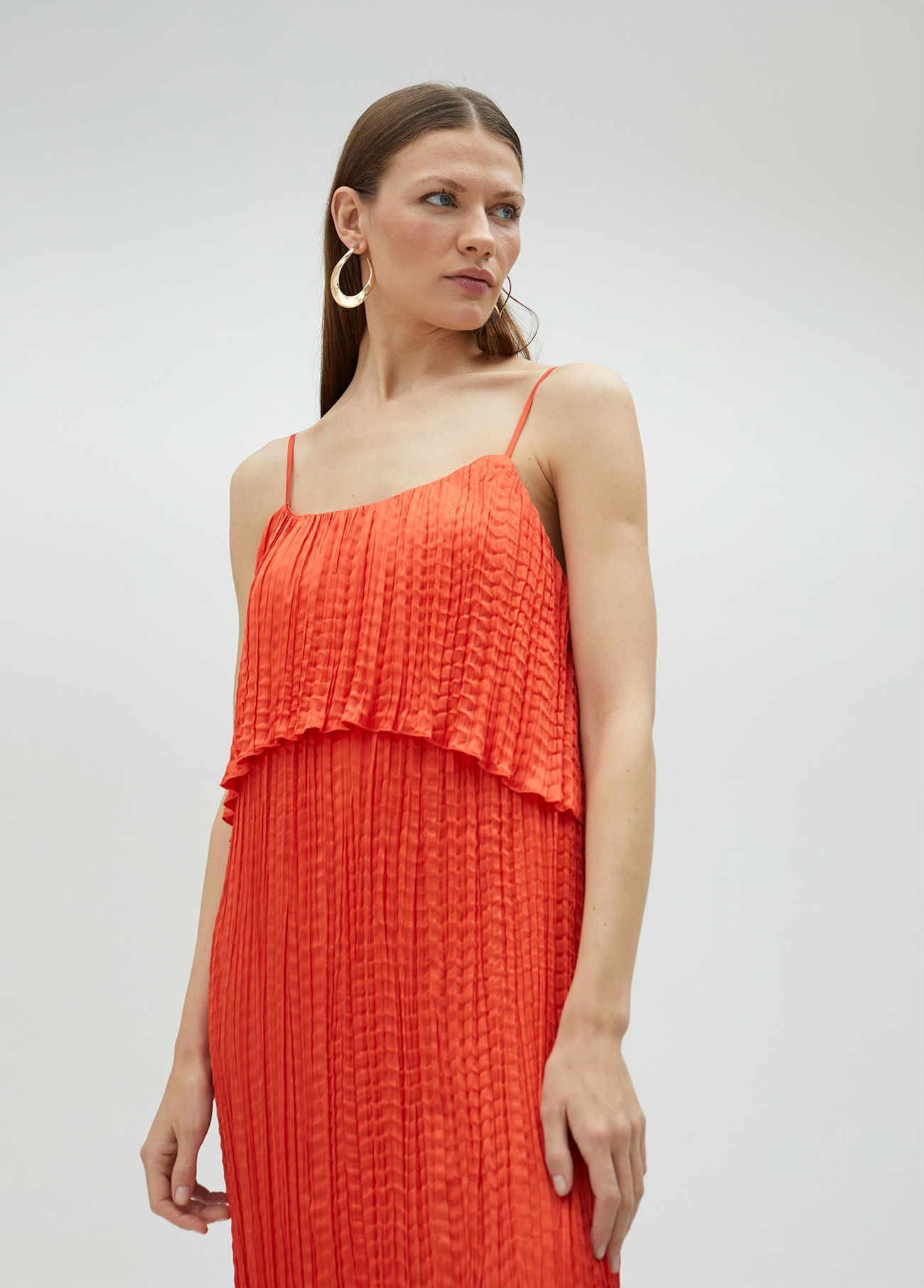 Το ανάλαφρο πλισέ ύφασμα χαρίζει ροή και αέρινη αίσθηση, ενώ οι λεπτές τιράντες και η layered γραμμή στο μπούστο προσθέτουν θηλυκότητα χωρίς υπερβολή.