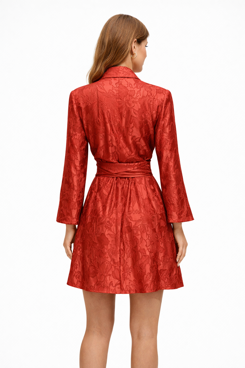 Mini φόρεμα σε πολυτελές σατέν jacquard ύφασμα με ανάγλυφο floral μοτίβο και διακριτική λάμψη που αναδεικνύει το έντονο κεραμυδί χρώμα.