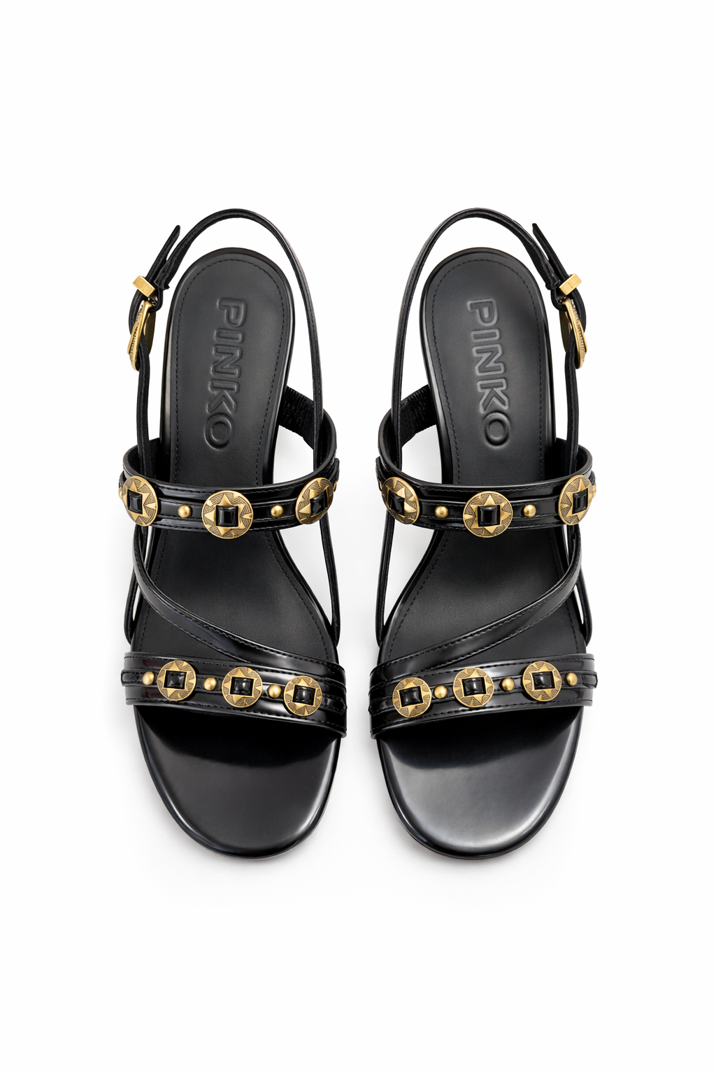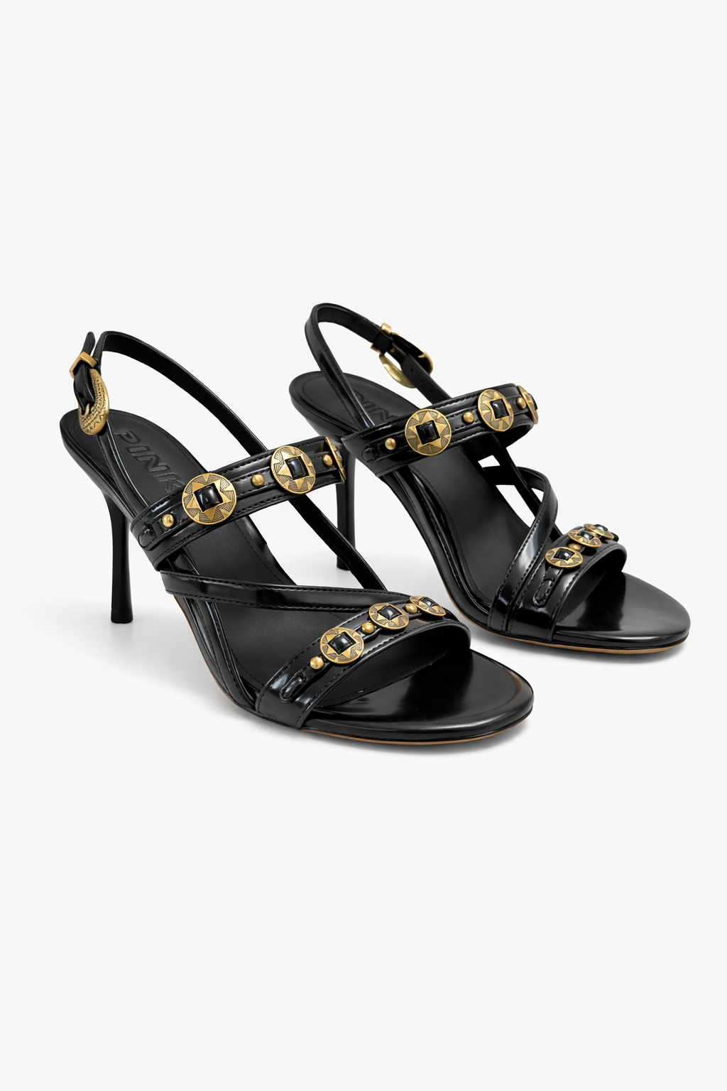 Πέδιλα slingback με ψηλό τακούνι και στρογγυλεμένη μύτη, κατασκευασμένα από ανθεκτικό ύφασμα με όψη λείου δέρματος, με λεπτές φάσες και λουράκια που διασταυρώνονται σαγηνευτικά στο επάνω μέρος του ποδιού. Ξεχωρίζουν για τη χαρακτηριστική προσοχή στη λεπτομέρεια των δημιουργιών PINKO: τα τρουκς που διακοσμούν τις δύο φάσες, προσδίδοντας ροκ και εκλεπτυσμένο στυλ, και η μεταλλική αγκράφα με ιδιαίτερα διακοσμητικά σχέδια, η οποία, πέρα από το ότι ολοκληρώνει λειτουργικά το ρυθμιζόμενο πίσω λουράκι, προσθέτει και ένα επιπλέον πολύτιμο στοιχείο. Με δερμάτινο πάτο εσωτερικά για ακόμα μεγαλύτερη άνεση και με λαστιχένια σόλα που εξασφαλίζει σταθερότητα σε κάθε βήμα, αυτά τα ψηλά πέδιλα θα σας συνοδεύσουν με δυναμισμό και κομψότητα σε γάμους, βαπτίσεις και ιδιαίτερες εκδηλώσεις.