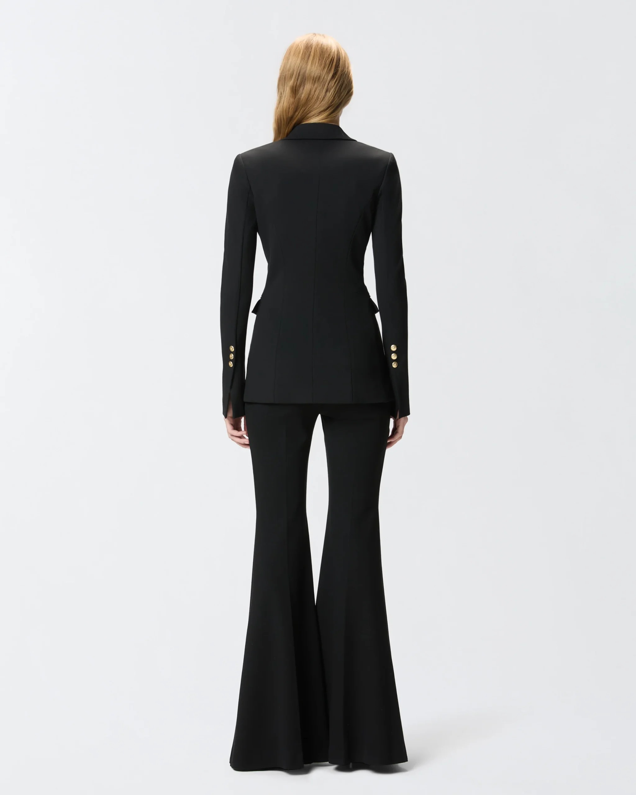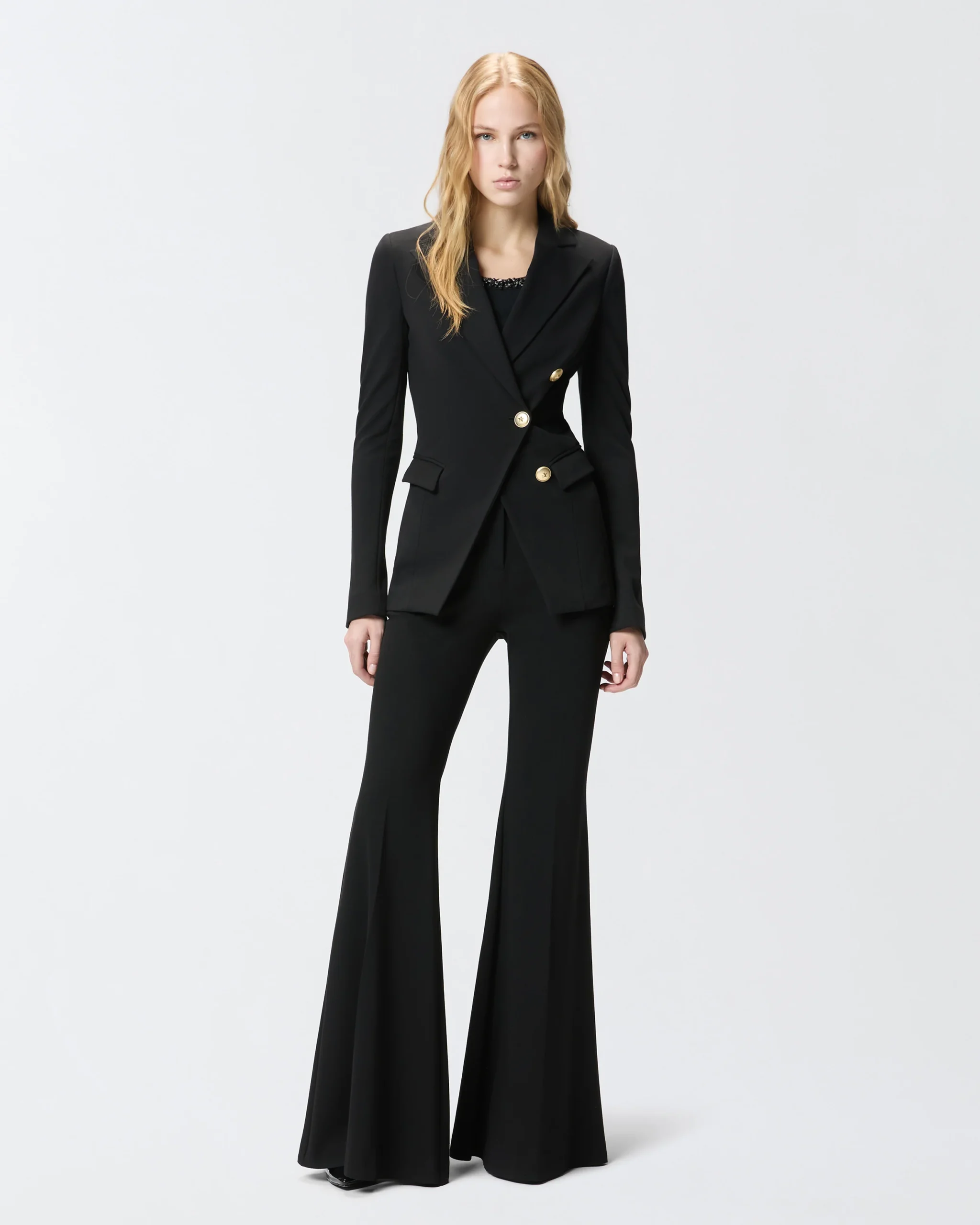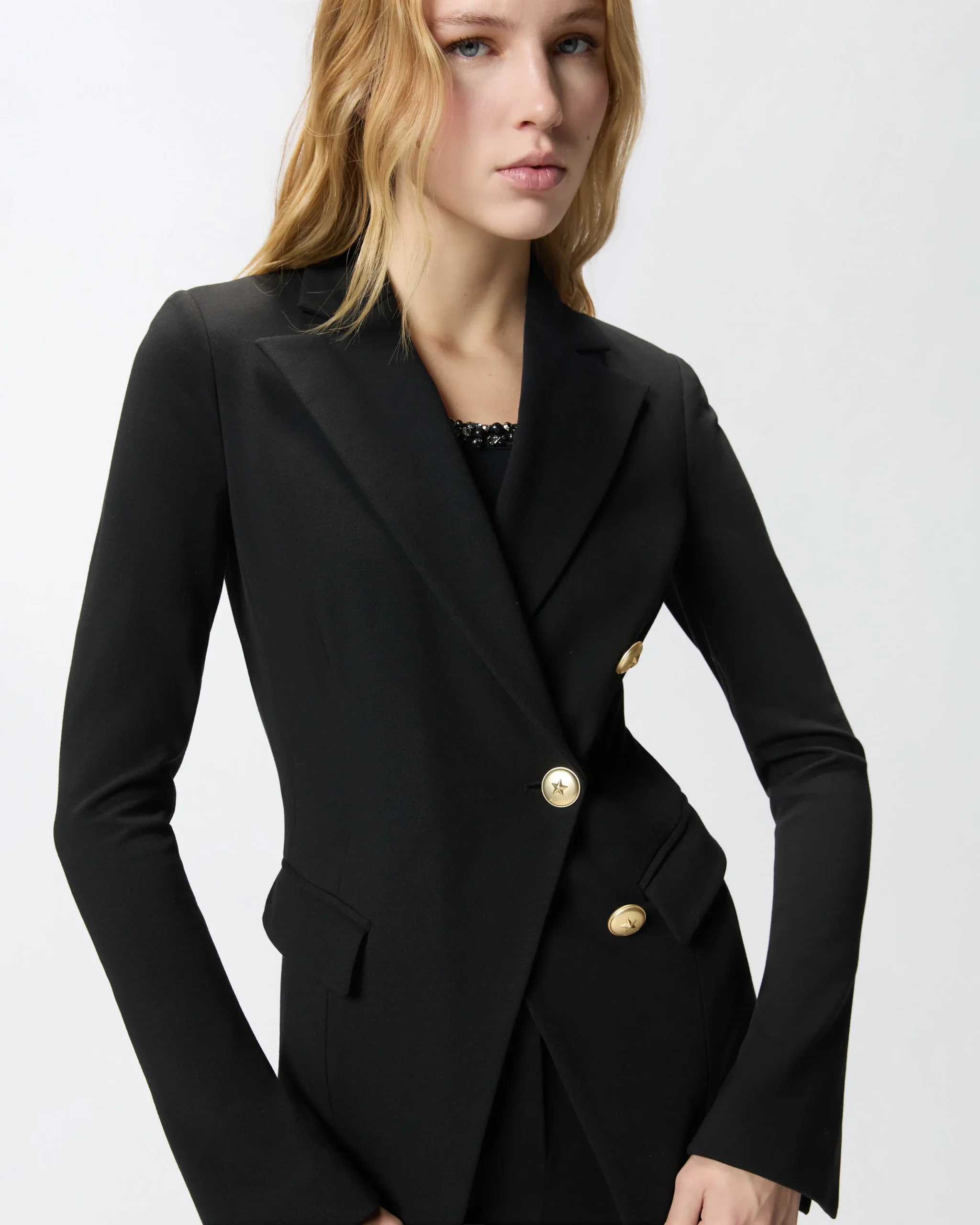 Κομψό γυναικείο σακάκι από ελαστική, τεχνική ποντοστόφα βισκόζης, με μια ειδική επεξεργασία που δίνει στο ύφασμα μια πυκνή και λεία υφή. Η λεπτομέρεια που κλέβει την παράσταση όμως είναι το κλείσιμο με κουμπιά διακοσμημένα με αστέρι που είναι τοποθετημένα έτσι ώστε να δημιουργούν την εντύπωση ενός ασύμμετρου σταυρωτού κουμπώματος. Το σακάκι διαθέτει φόδρα στον ωμίτη στην πλάτη για περισσότερη άνεση και καλύτερη εφαρμογή, ενώ το υπόλοιπο σακάκι δεν έχει φόδρα για να αναδεικνύεται καλύτερα η φυσική κίνηση του υφάσματος. Το σακάκι έχει μεσάτη εφαρμογή, πιο εφαρμοστή στους γοφούς. Συνδυάστε το σακάκι με το παντελόνι από το ίδιο ύφασμα για να δημιουργήσετε ένα ταγέρ ή φορέστε το με ένα πουκάμισο για ελαφρώς επίσημο στυλ.