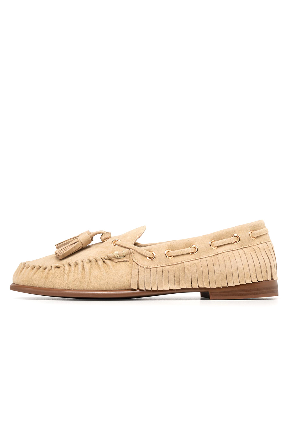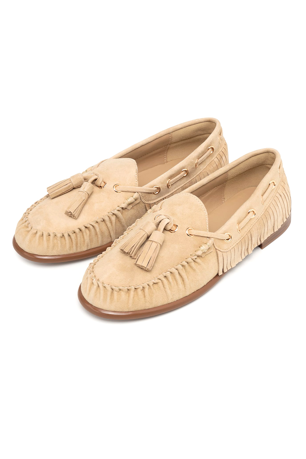 Ένα ιδιαίτερο flat σχέδιο που συνδυάζει άνεση και στιλ, ιδανικό για καθημερινές αλλά και πιο προσεγμένες εμφανίσεις. Διαθέτει κλασική γραμμή moccasin, διακοσμητικά κορδόνια με χρυσές λεπτομέρειες, κρόσσια στο πλάι και tassels στο επάνω μέρος που χαρίζουν boho chic χαρακτήρα. Η μαλακή υφή του και η επίπεδη σόλα το κάνουν ιδανική επιλογή για όλες τις ώρες της ημέρας.