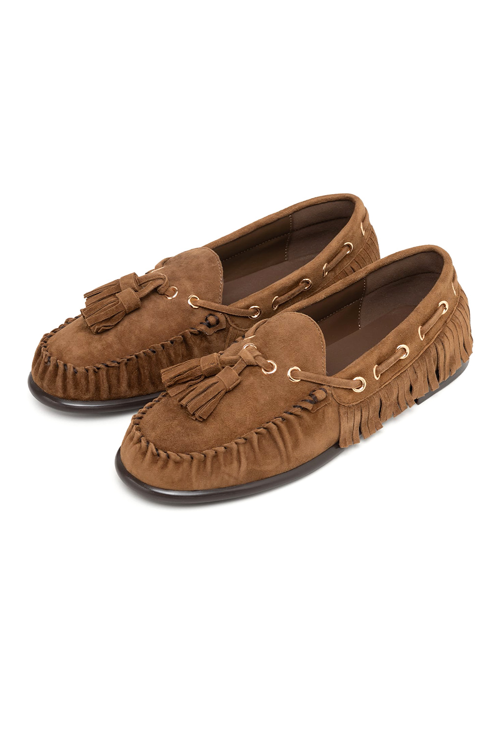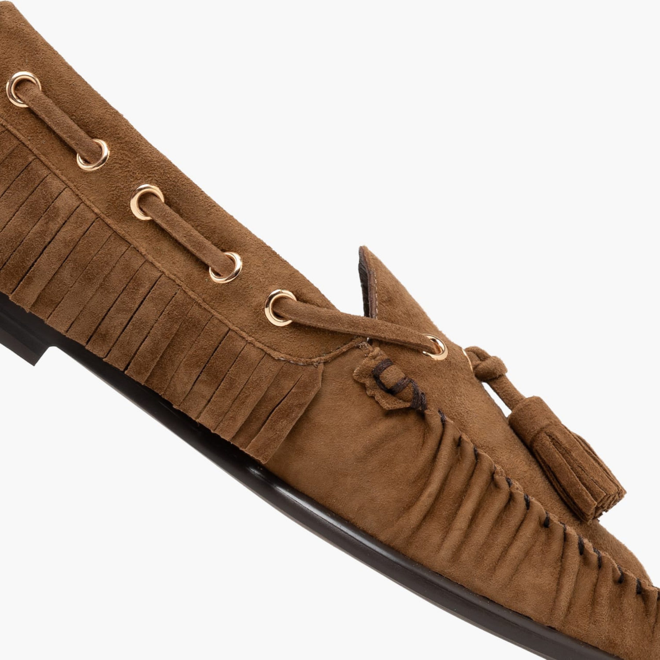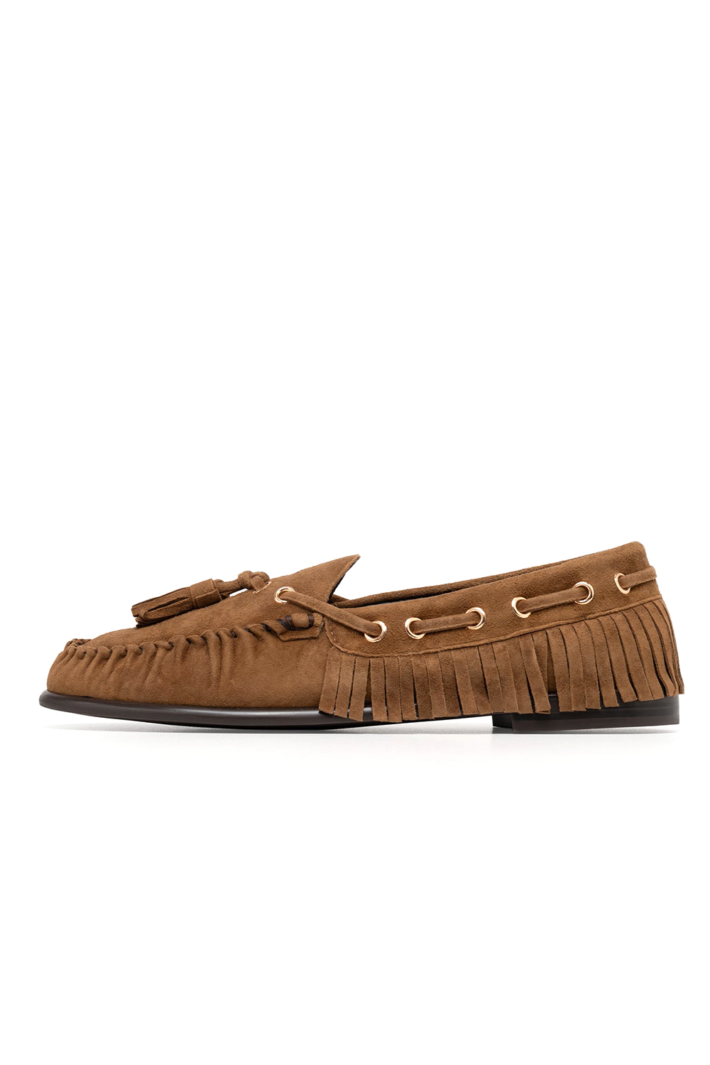 Ένα ιδιαίτερο flat σχέδιο που συνδυάζει άνεση και στιλ, ιδανικό για καθημερινές αλλά και πιο προσεγμένες εμφανίσεις. Διαθέτει κλασική γραμμή moccasin, διακοσμητικά κορδόνια με χρυσές λεπτομέρειες, κρόσσια στο πλάι και tassels στο επάνω μέρος που χαρίζουν boho chic χαρακτήρα. Η μαλακή υφή του και η επίπεδη σόλα το κάνουν ιδανική επιλογή για όλες τις ώρες της ημέρας.