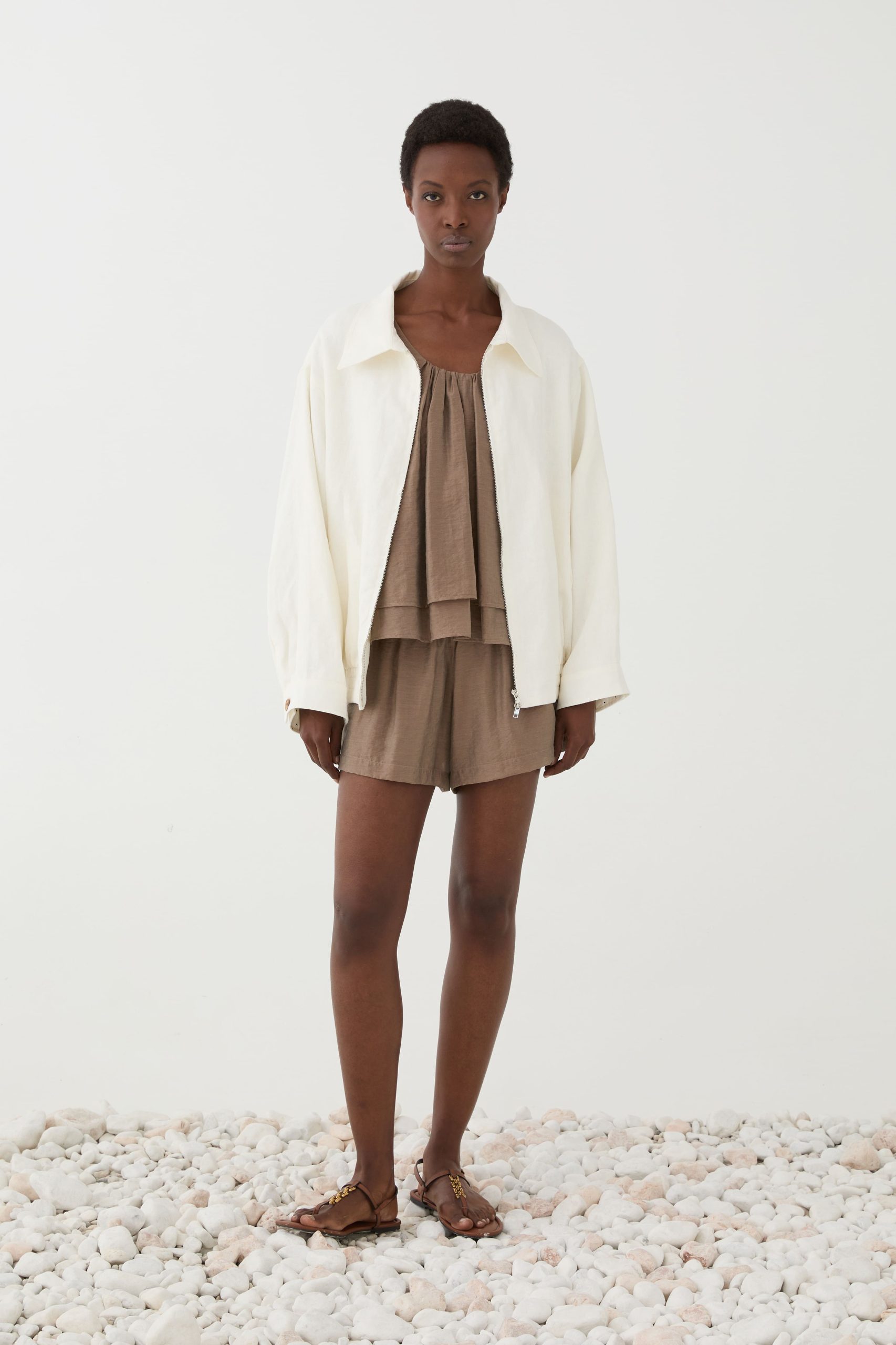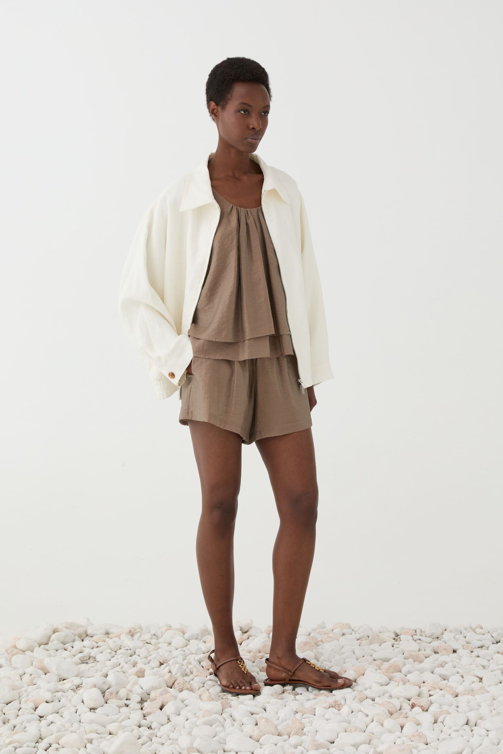 Διαθέτει κλείσιμο με φερμουάρ, διακριτικό γιακά και ελαστικό τελείωμα στο πίσω μέρος που δημιουργεί όμορφη εφαρμογή στη μέση. Η χαλαρή, άνετη γραμμή του επιτρέπει εύκολο layering πάνω από tops, πουκάμισα ή καλοκαιρινά σετ, ενώ το ουδέτερο χρώμα συνδυάζεται effortlessly με μπεζ, καφέ, denim και λευκές αποχρώσεις.