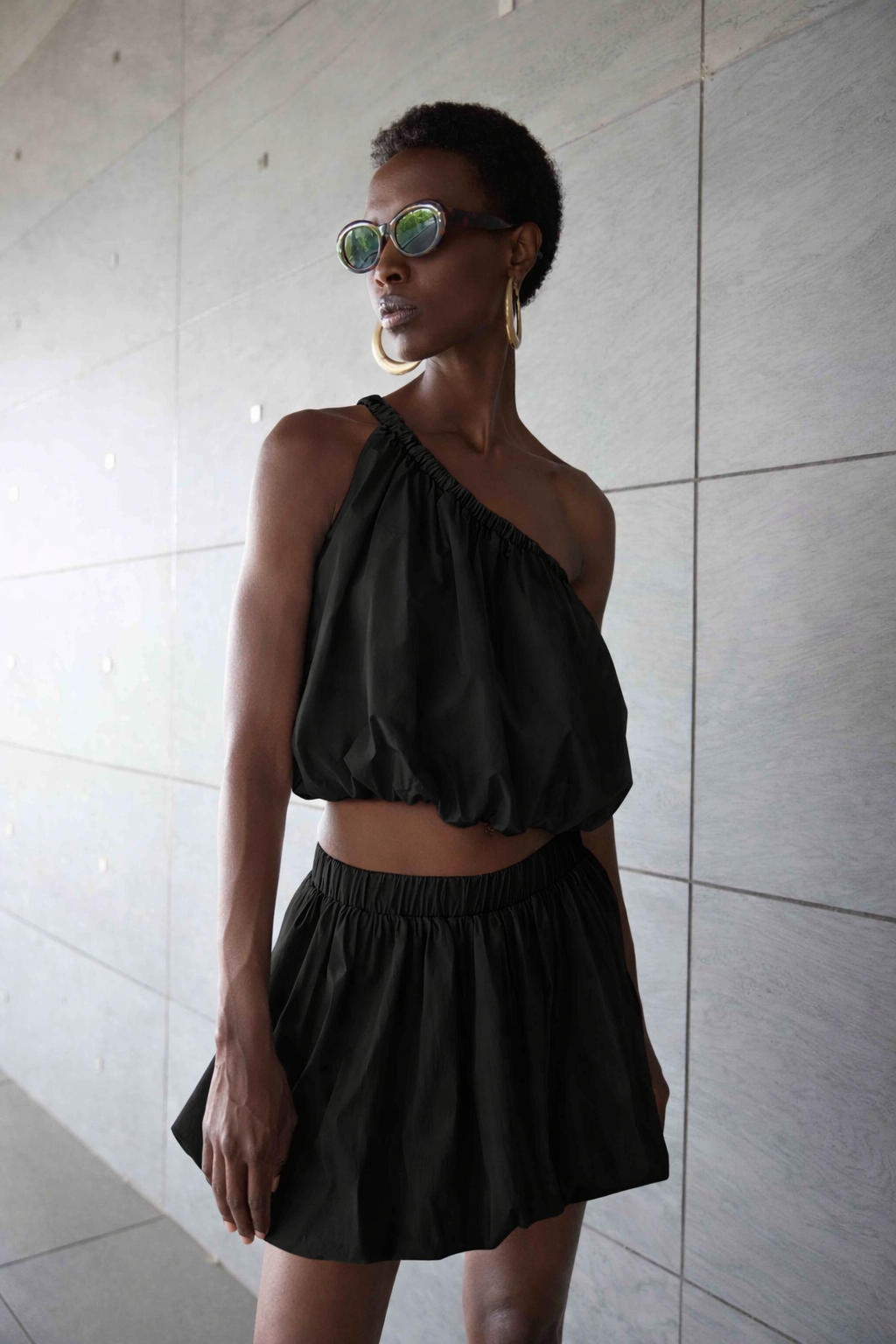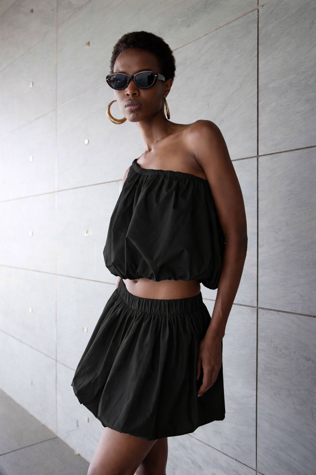 Μαύρη ασύμμετρη μπλούζα με έναν ώμο που αποπνέει μοντέρνα κομψότητα. Διαθέτει ελαστικό τελείωμα στο επάνω μέρος για σταθερή εφαρμογή και χαλαρή, balloon γραμμή που δημιουργεί όμορφη κίνηση και ανάλαφρη αίσθηση.