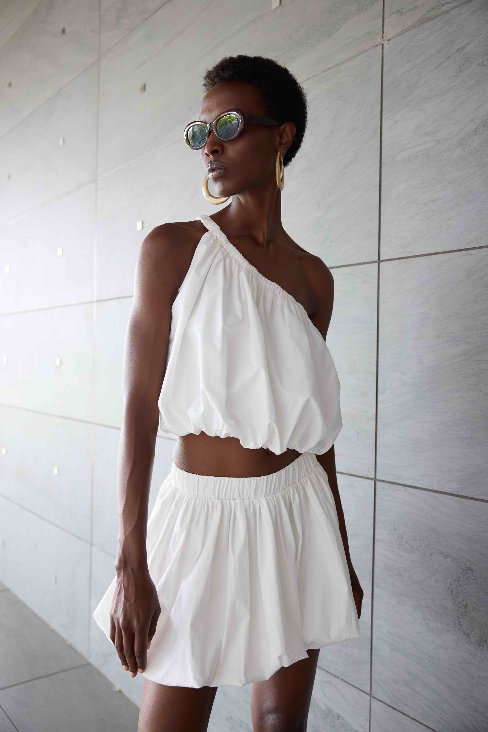 Εντυπωσιακή και ταυτόχρονα ultra chic, αυτή η λευκή one-shoulder μπλούζα είναι το απόλυτο statement κομμάτι του καλοκαιριού. Ο ασύμμετρος ώμος χαρίζει μοντέρνα αισθητική, ενώ η ελαστική λαιμόκοψη και το τελείωμα δημιουργούν ένα διακριτικό balloon εφέ που αγκαλιάζει το σώμα με θηλυκότητα.