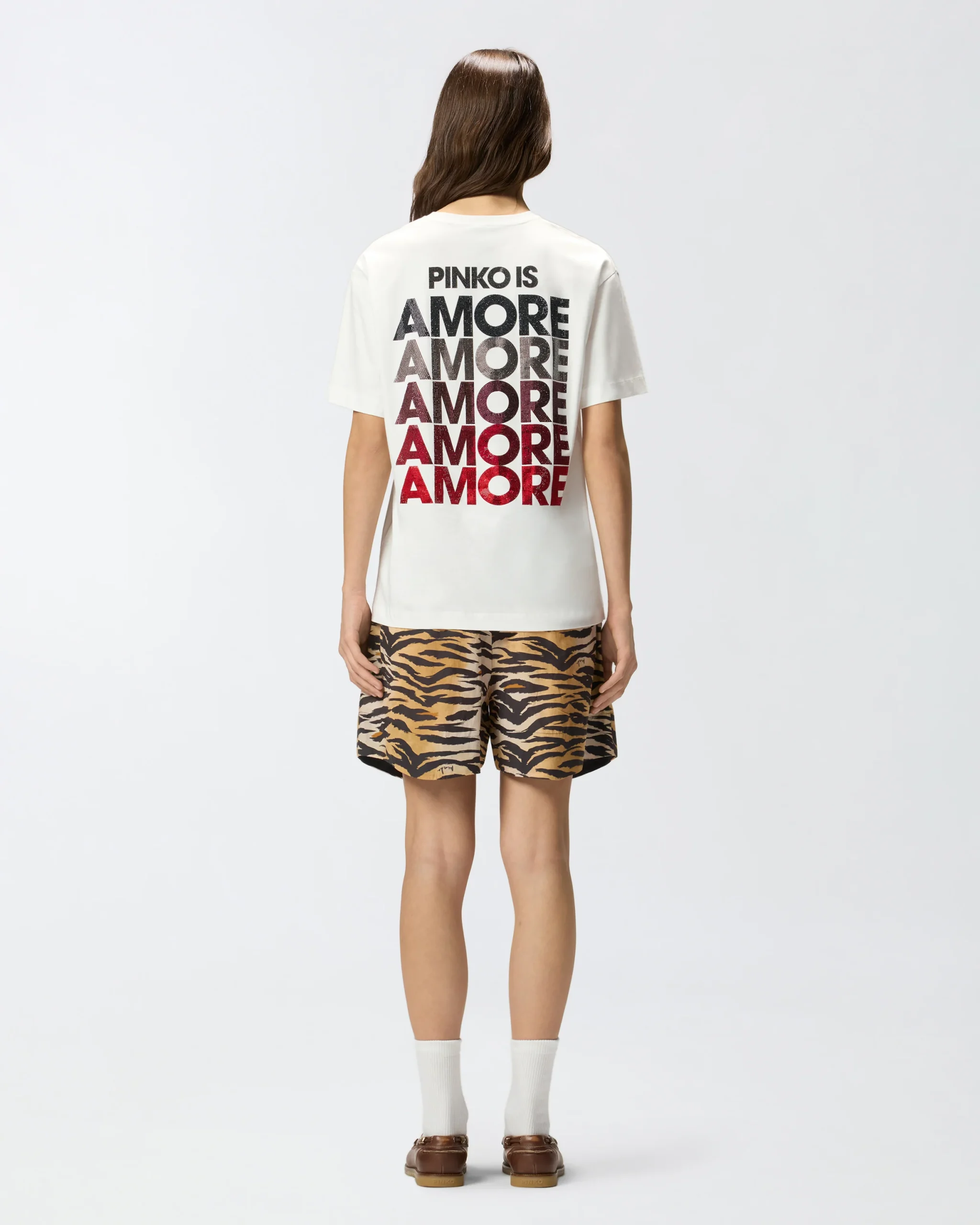 Κοντομάνικο t-shirt από απαλό βαμβακερό ζέρσεϊ ύφασμα με στρογγυλή λαιμόκοψη. Χαρακτηρίζεται από την πολύχρωμη ντεγκραντέ φράση PINKO IS AMORE με στρας στην πλάτη και το λογότυπο PINKO που σχηματίζει μια μικρή καρδιά με στρας στο στήθος. Ένα βασικό κομμάτι σε μια νέα έκδοση με το χαρακτηριστικό στυλ της PINKO, ιδανικό σε συνδυασμό με ένα τζιν ή με το αγαπημένο σας παντελόνι για ένα glam και πρωτότυπο look.